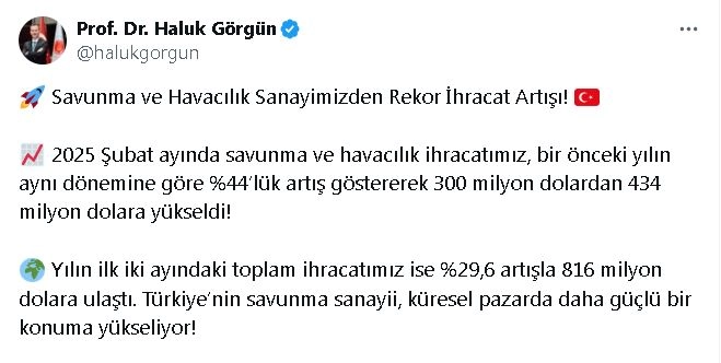 ANKARA, (DHA)- SAVUNMA Sanayii Başkanı Haluk Görgün, 2025 Şubat ayında savunma ve havacılık ihracatının, bir önceki yılın aynı dönemine göre yüzde 44 artış göstererek, 300 milyon dolardan 434 milyon dolara yükseldiğini açıkladı.Savunma Sanayii Başkanı Haluk Görgün, sosyal medya hesabından yaptığı açıklamada, "Savunma ve havacılık sanayimizden rekor ihracat artışı. 2025 Şubat ayında savunma ve havacılık ihracatımız, bir önceki yılın aynı dönemine göre yüzde 44'lük artış göstererek 300 milyon dolardan 434 milyon dolara yükseldi. Yılın ilk 2 ayındaki toplam ihracatımız ise yüzde 29,6 artışla 816 milyon dolara ulaştı. Türkiye'nin savunma sanayii, küresel pazarda daha güçlü bir konuma yükseliyor" ifadelerini kullandı.'KALICI BİR ARTIŞ TRENDİ YAKALAMAYI HEDEFLİYORUZ'Katma değerli ürünlerde sürdürülebilir artış hedeflediklerini aktaran Görgün, "Savunma Sanayii Başkanlığı olarak yüksek teknolojiye dayalı, katma değeri yüksek ürünlerimizin ihracatında kalıcı bir artış trendi yakalamayı hedefliyoruz. Başkanlığımızın yürüttüğü kesintisiz uluslararası iş birliği faaliyetleri ile şirketlerimizin maliyet etkin-yüksek teknoloji çözümleri sayesinde sektörümüz belli bir bölgeye değil, dünyanın dört bir yanına ihracat yapabilir hale gelmiştir. Önümüzdeki dönemde hem büyük ölçekli şirketlerimizi hem de KOBİ'lerimizi destekleyen, ihracat yapan firma sayımızı artıran ve ihracatı tüm sektör için sürdürülebilir bir güç haline getiren uluslararası faaliyetlerimizi kararlılıkla sürdüreceğiz. Bu büyük başarıda emeği geçen başkanlığımız personelini, şirketlerimizi, KOBİ'lerimizi, mühendislerimizi ve sektör paydaşlarımızı tebrik ediyorum! Savunma sanayimiz yükselmeye devam edecek" açıklamasında bulundu. (DHA)