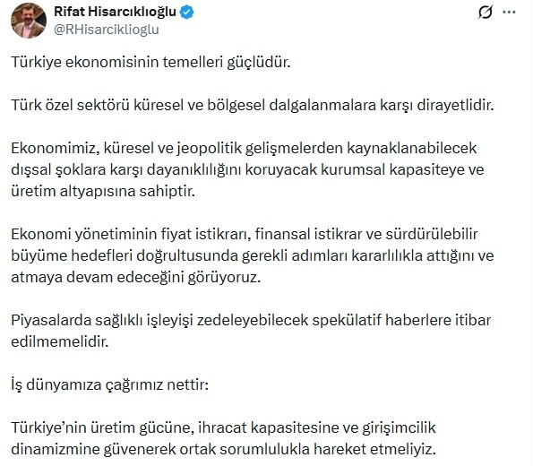 Hisarcıklıoğlu, sanal medya hesabından yaptığı açıklamada, "Türkiye ekonomisinin temelleri güçlüdür. Türk özel sektörü küresel ve bölgesel dalgalanmalara karşı dirayetlidir. Ekonomimiz, küresel ve jeopolitik gelişmelerden kaynaklanabilecek dışsal şoklara karşı dayanıklılığını koruyacak kurumsal kapasiteye ve üretim altyapısına sahiptir. Ekonomi yönetiminin fiyat istikrarı, finansal istikrar ve sürdürülebilir büyüme hedefleri doğrultusunda gerekli adımları kararlılıkla attığını ve atmaya devam edeceğini görüyoruz. Piyasalarda sağlıklı işleyişi zedeleyebilecek spekülatif haberlere itibar edilmemelidir. İş dünyamıza çağrımız nettir: Türkiye’nin üretim gücüne, ihracat kapasitesine ve girişimcilik dinamizmine güvenerek ortak sorumlulukla hareket etmeliyiz” ifadelerini kullandı. (DHA)