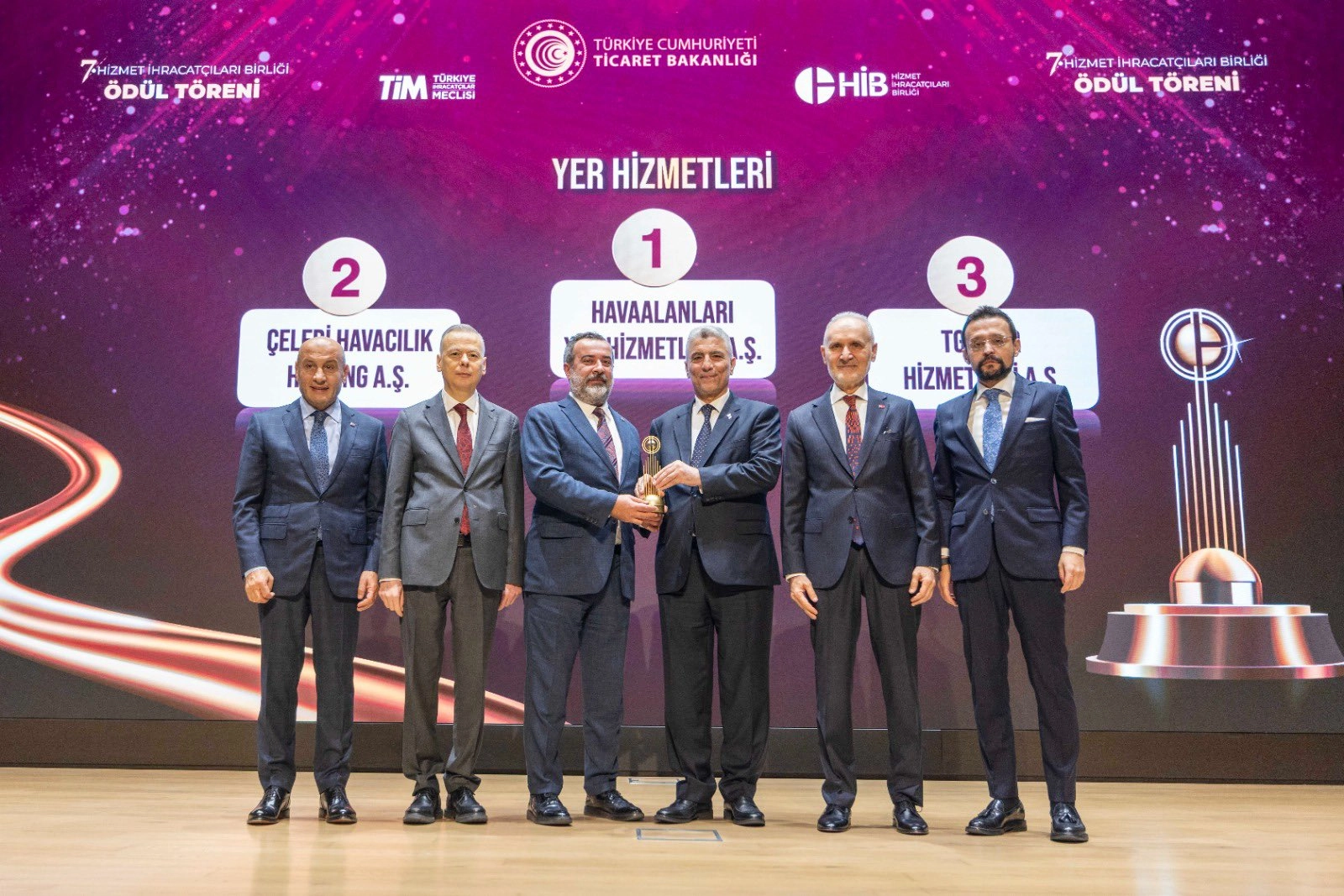 'Hizmet İhracatının Şampiyonları' yedinci kez düzenlenen ödül töreni İstanbul’da gerçekleşti. Hizmet İhracatçıları Birliği (HİB) Başkanı Şekib Avdagiç’in ev sahipliğinde düzenlenen ödül törenine Ticaret Bakanı Prof. Dr. Ömer Bolat, Türkiye İhracatçılar Meclisi (TİM) Başkanı Mustafa Gültepe ve HİB üyeleri katıldı. Yer hizmetleri kategorisinde 3’ncülük ödülünü alan TGS’nin sosyal medya hesabında yapılan paylaşımda, “Sürdürülebilirlik büyümede Türkiye ekonomisi ve istihdamının lokomotif gücü olan Hizmet İhracatçıları Birliği’nin bir üyesi olarak ülkemize değer katmaya devam ediyoruz” açıklamasında bulundu.