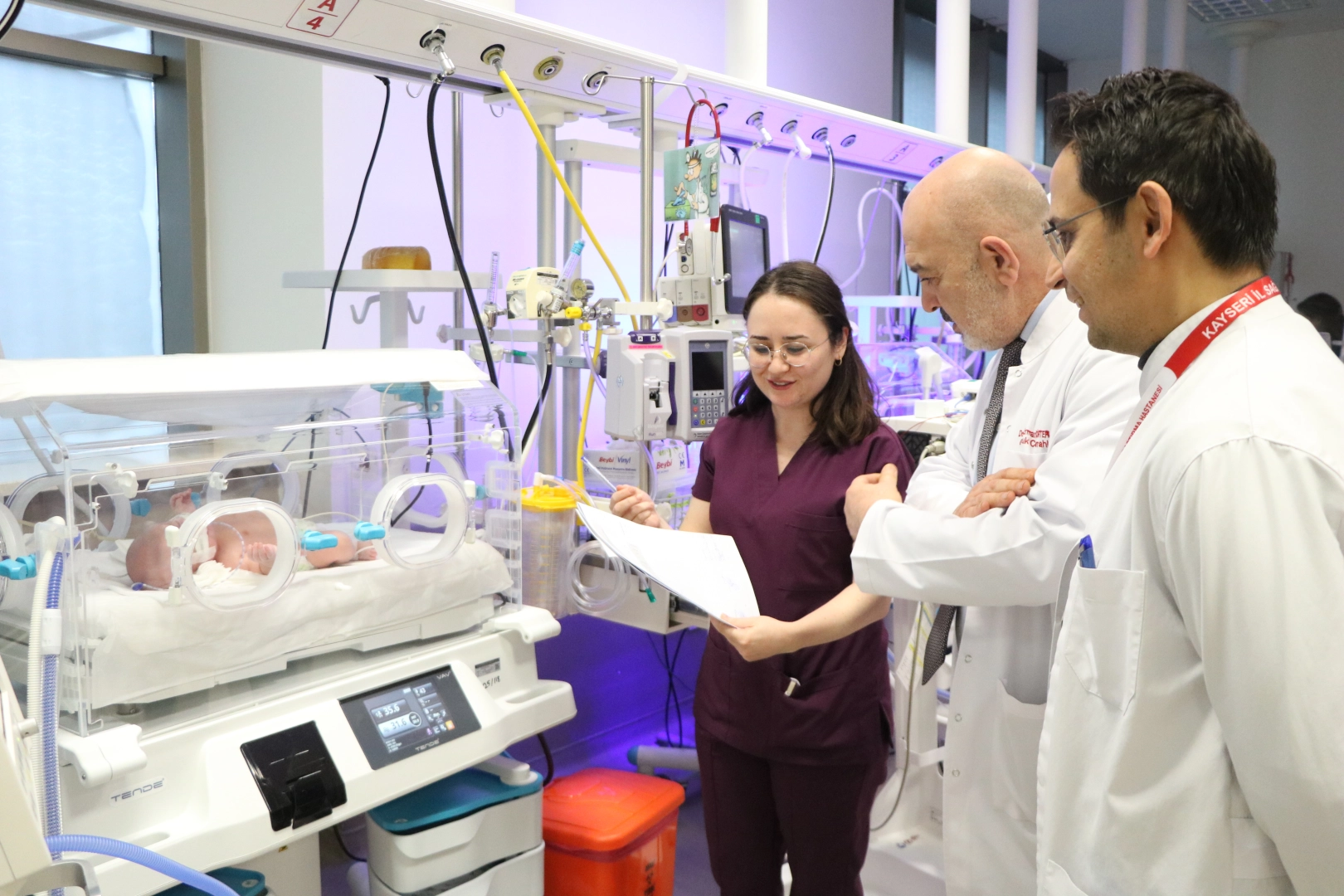 Kayseri Şehir Hastanesi Pediatri ve Yenidoğan Klinik Şefi Prof. Dr. Ahmet Özdemir ise “Yenidoğan yoğun bakım ünitesi olarak 57 kuvözle hizmet vermekteyiz ve bu kuvözlerde 4’üncü düzeyden başlayan ciddi hastalıkların tedavisini yapmaktayız. Bize gelen minik savaşçımız aslında geldiği dönemde durumu çok kritikti ve bu kritik dönemde de ciddi solunum sıkıntısıyla başvurmuştu. Bu hastalar intrauterin döneminde bizim özellikle perinatoloji merkezimizin fetal ultrasonlarıyla ve ardından onların yönlendirmesi ile beraber çocuk kardiyoloji ekibimizin fetal ekokardiyografi incelemeleriyle bize tanı olarak da gelebiliyorlar. Böyle olduğu zaman da bizim işimizi çok kolaylaştırıyor aslında. Biz doğum sürecine ona göre hazırlıklı gidiyoruz. Bunların sonraki dönemlerinde yaşayacağı problemleri öngördüğümüz için ona göre ileri düzey ventilasyon stratejilerimizi geliştiriyoruz ki artık merkezimiz gerçekten üst düzey mekanik ventilasyonlarla hizmet veriyor. Bu konuda da Kayseri Şehir Hastanesi yönetimimize başta Başhekimimiz Profesör Doktor İbrahim Özcan olmak üzere minnetlerimi sunuyorum” diye konuştu. (DHA)