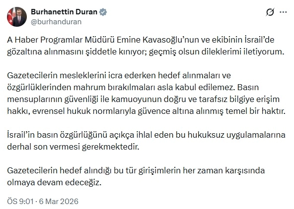 İletişim Başkanı Burhanettin Duran sanal medya hesabından yaptığı paylaşımda, “A Haber Programlar Müdürü Emine Kavasoğlu’nun ve ekibinin İsrail’de gözaltına alınmasını şiddetle kınıyor; geçmiş olsun dileklerimi iletiyorum. Gazetecilerin mesleklerini icra ederken hedef alınmaları ve özgürlüklerinden mahrum bırakılmaları asla kabul edilemez. Basın mensuplarının güvenliği ile kamuoyunun doğru ve tarafsız bilgiye erişim hakkı, evrensel hukuk normlarıyla güvence altına alınmış temel bir haktır. İsrail’in basın özgürlüğünü açıkça ihlal eden bu hukuksuz uygulamalarına derhal son vermesi gerekmektedir. Gazetecilerin hedef alındığı bu tür girişimlerin her zaman karşısında olmaya devam edeceğiz” ifadelerini kullandı. (DHA)