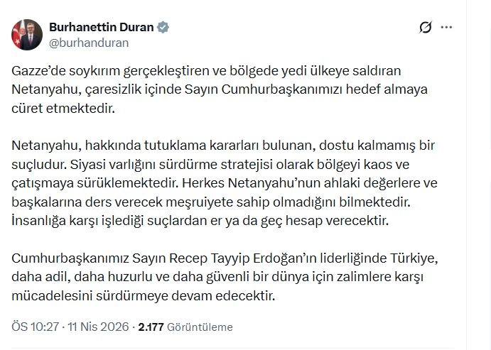 İletişim Başkanı Burhanettin Duran, sanal medya üzerinden yaptığı paylaşımda, "Gazze’de soykırım gerçekleştiren ve bölgede yedi ülkeye saldıran Netanyahu, çaresizlik içinde Sayın Cumhurbaşkanımızı hedef almaya cüret etmektedir. Netanyahu, hakkında tutuklama kararları bulunan, dostu kalmamış bir suçludur. Siyasi varlığını sürdürme stratejisi olarak bölgeyi kaos ve çatışmaya sürüklemektedir. Herkes Netanyahu’nun ahlaki değerlere ve başkalarına ders verecek meşruiyete sahip olmadığını bilmektedir. İnsanlığa karşı işlediği suçlardan er ya da geç hesap verecektir. Cumhurbaşkanımız Sayın Recep Tayyip Erdoğan’ın liderliğinde Türkiye, daha adil, daha huzurlu ve daha güvenli bir dünya için zalimlere karşı mücadelesini sürdürmeye devam edecektir" ifadelerine yer verdi. (DHA)