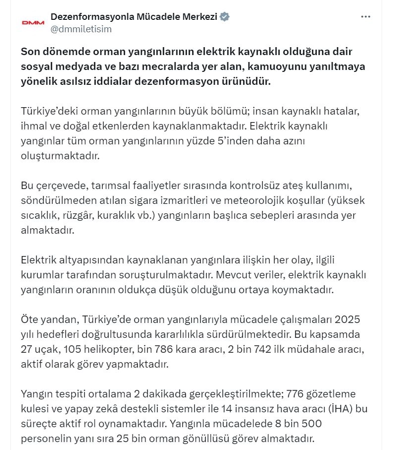 ANKARA, (DHA)- İLETİŞİM Başkanlığı Dezenformasyonla Mücadele Merkezi (DMM), orman yangınlarının elektrik kaynaklı olduğuna dair iddialara ilişkin, "Türkiye'deki orman yangınlarının büyük bölümü; insan kaynaklı hatalar, ihmal ve doğal etkenlerden kaynaklanmaktadır. Elektrik kaynaklı yangınlar tüm orman yangınlarının yüzde 5'inden daha azını oluşturmaktadır" açıklamasını yaptı.DMM'nin sosyal medya hesabından yapılan açıklamada, "Son dönemde orman yangınlarının elektrik kaynaklı olduğuna dair sosyal medyada ve bazı mecralarda yer alan, kamuoyunu yanıltmaya yönelik asılsız iddialar dezenformasyon ürünüdür. Türkiye'deki orman yangınlarının büyük bölümü; insan kaynaklı hatalar, ihmal ve doğal etkenlerden kaynaklanmaktadır. Elektrik kaynaklı yangınlar tüm orman yangınlarının yüzde 5'inden daha azını oluşturmaktadır. Bu çerçevede, tarımsal faaliyetler sırasında kontrolsüz ateş kullanımı, söndürülmeden atılan sigara izmaritleri ve meteorolojik koşullar (yüksek sıcaklık, rüzgar, kuraklık vb.) yangınların başlıca sebepleri arasında yer almaktadır" denildi.'ELEKTRİK KAYNAKLI YANGINLARIN ORANI OLDUKÇA DÜŞÜK'Ayrıca, elektrik altyapısından kaynaklanan yangınlara ilişkin her olayın, ilgili kurumlar tarafından soruşturulduğu belirtilerek, "Mevcut veriler, elektrik kaynaklı yangınların oranının oldukça düşük olduğunu ortaya koymaktadır. Öte yandan, Türkiye'de orman yangınlarıyla mücadele çalışmaları 2025 yılı hedefleri doğrultusunda kararlılıkla sürdürülmektedir. Bu kapsamda 27 uçak, 105 helikopter, 1786 kara aracı, 2 bin 742 ilk müdahale aracı aktif olarak görev yapmaktadır. Yangın tespiti ortalama 2 dakikada gerçekleştirilmekte; 776 gözetleme kulesi ve yapay zeka destekli sistemler ile 14 insansız hava aracı (İHA) bu süreçte aktif rol oynamaktadır. Yangınla mücadelede 8 bin 500 personelin yanı sıra 25 bin orman gönüllüsü görev almaktadır. Bu çerçevede, kamuoyunun yalnızca resmi kaynaklarca paylaşılan bilgi ve açıklamalara itibar etmesi hem doğru bilgilendirme hem de afetle etkin mücadele açısından büyük önem taşımaktadır" ifadelerine yer verildi. (DHA)