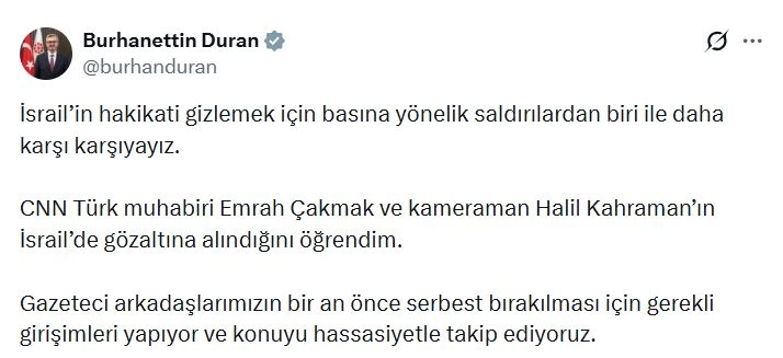 ANKARA, (DHA)- İLETİŞİM Başkanı Burhanettin Duran, "CNN Türk muhabiri Emrah Çakmak ve kameraman Halil Kahraman’ın İsrail’de gözaltına alındığını öğrendim. Gazeteci arkadaşlarımızın bir an önce serbest bırakılması için gerekli girişimleri yapıyoruz" dedi.