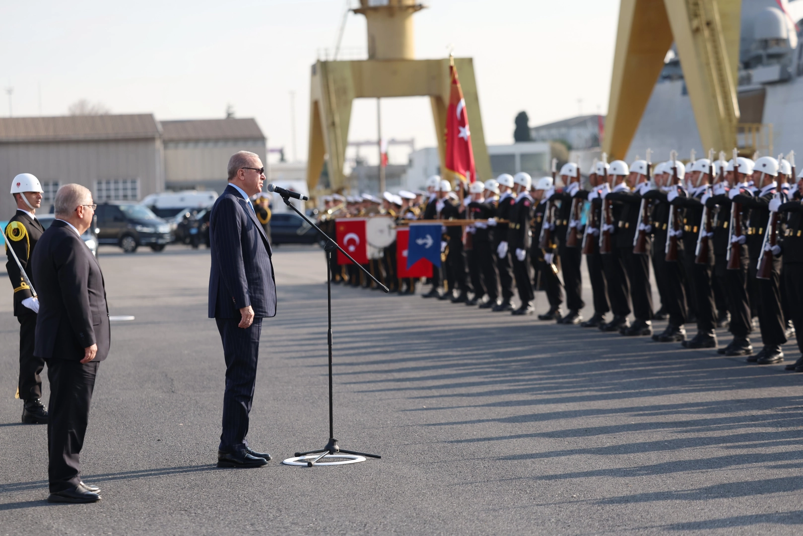 Cumhurbaşkanı Erdoğan sözlerine törenin anlam ve önemine değinerek başladı. Cumhurbaşkanı Erdoğan, “Bugün çok özel bir program münasebetiyle, dünyanın göz bebeği İstanbul'da, İstanbul Tersane Komutanlığımızda sizlerle bir aradayız. Deniz platformlarımızın hizmete giriş, bayrak çekme ve ilk sac kesme töreni vesilesiyle sizlerle bir arada olmaktan memnuniyet duyuyorum. Törenimizi Pakistan'dan teşrif eden kıymetli misafirlerimize, 'ikinci eviniz olan Türkiye'ye hoş geldiniz, sefalar getirdiniz' diyorum. Mavi Vatan'ın dört bir yanında büyük bir fedakarlıkla görev yapan Deniz Kuvvetleri Komutanlığımızın tüm mensuplarına ayrı ayrı teşekkür ediyorum. Türkiye için çalışan, Mavi Vatan'ın muhafazası ve gerektiğinde müdafaası için gecesini gündüzüyle birleştiren herkesten Cenab-ı Allah razı olsun. Yine bu vesileyle, asırlardır nazlı hilalin özgürce dalgalanması için toprağa düşen şehitlerimizi rahmetle anıyor, gazilerimize şükranlarımı sunuyorum” diye konuştu.