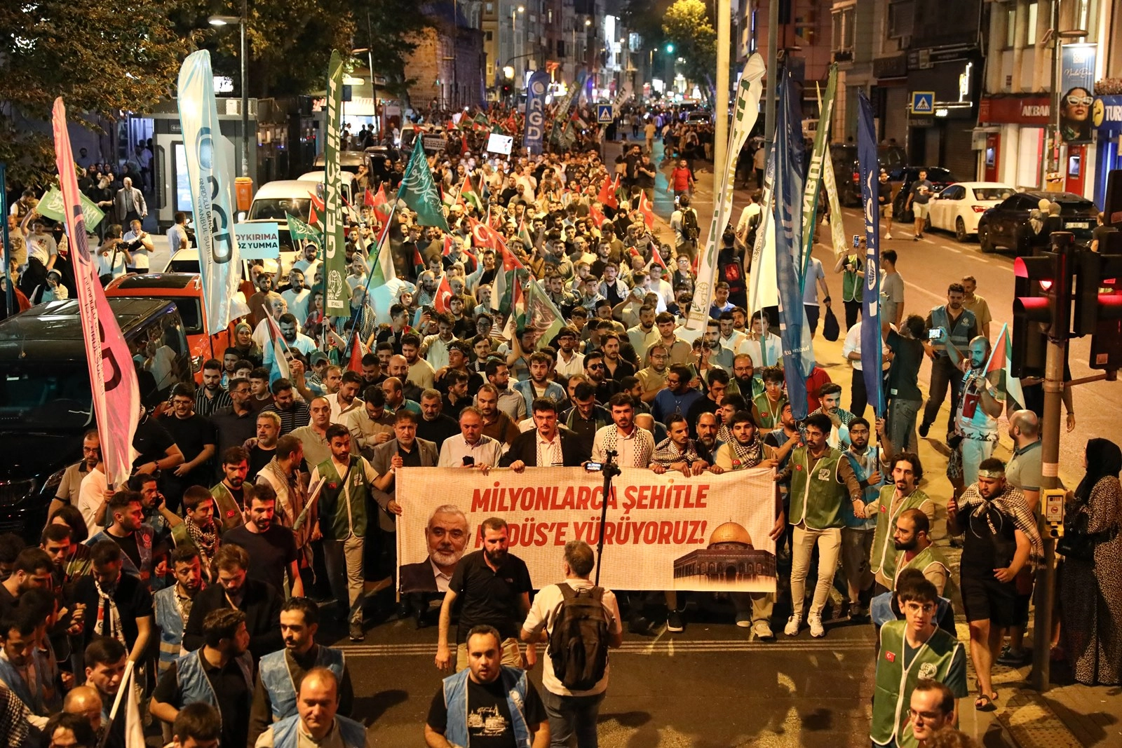 İSTANBUL, (DHA)- İHH’nın da aralarında bulunduğu çok sayıda sivil toplum kuruluşu tarafından, İran'da suikast sonucu hayatını kaybeden Hamas’ın Siyasi Büro Şefi İsmail Haniye ve Filistin’de hayatını kaybedenler için yürüyüş düzenlendi. Fatih Camii önünden başlayan ve Beyazıt Meydanı’nda sona eren yürüyüşe on binlerce kişi katıldı.İHH İnsani Yardım Vakfı öncülüğünde İran’da suikast sonucu hayatını kaybeden İsmail Haniye ve Filistin’de hayatını kaybedenler için yürüyüş gerçekleştirildi. On binlerce kişinin katıldığı yürüyüş, akşam namazının ardından Fatih Camii önünden başladı, Beyazıt Meydanı’na kadar devam etti. On binlerce katılımcı, yürüyüş boyunca ‘Yaşasın Küresel İntifada, Katil İsrail, İşbirlikçi ABD, Katil İsrail Filistin’den Defol’ sloganları attı, tekbirler getirdi. Beyazıt Meydanı’ndaki program, Kur’an-ı Kerim tilaveti ile başladı. Tilavetin ardından sivil toplum kuruluşu temsilcileri tarafından konuşmalar yapıldı.ÇELİK: BUGÜN SAFLARI DAHA FAZLA SIKLAŞTIRMAK ZORUNDAYIZİHH Başkanı Cihat Çelik, “Bugün safları daha fazla sıklaştırmak zorundayız. Tefrikadan kaçınmamız gerekiyor. Uzun sürecek bir mücadelenin başlangıcındayız. Bu mücadeleyi ancak safları sıklaştırarak birlikte yürütebiliriz” dedi.Mavi Marmara Derneği Başkanı İsmail Songür ise, “Gazze’de olanlar sadece izlenirken, Gazzeliler her sabah şehadete uyanıyorlar” diyerek Gazze’ye gönderilmesi planlanan Özgürlük Filosu ile ilgili gelişmeleri kamuoyuyla paylaşacaklarını belirtti.YAROĞLU: BABAMIN KANI FİLİSTİNLİ HERHANGİ BİR ÇOCUĞUN KANINDAN DAHA DEĞERLİ DEĞİLAGD İstanbul İl Başkanı Mehmet Yaroğlu, İsmail Haniye’nin oğlu Abdusselam Haniye ile yaptıkları telefon görüşmesini anlattı. Yaroğlu, oğul Haniye’nin görüşmede, “Benim babamın kanı Filistinli herhangi bir çocuğun kanından daha değerli değildir. Mahsunuz, gözümüz yaşlı. Ancak asla ye’se kapılmıyoruz. Mücadeleden asla ve asla geri durmayacağız” dediğini aktardı. Siyer Vakfı Kurucusu Muhammed Emin Yıldırım da, “Eğer bir dava en iyilerini Allah yolunda kurban vermeye başlamışsa zafer yakındır. Biz iman etmiş insanlarız, bir davaya gönül vermişiz ve bu yolda kurban olana kadar Filistin davasını, Mescid-i Aksa davasını asla geri bırakmayacağız. Bütün zalimlerle, bütün tağutlarla, bütün işbirlikçilerle, bütün yardakçılarla sonuna kadar mücadele edeceğiz” ifadelerini kullandı.Eylemde, Filistinli Aktivist Talal Nasır, TÜGVA İstanbul İl Başkanı Beytullah Çiçen, Gazze Dayanışma Platformu Sözcüsü Necmettin Irmak ve Yedi Hilal Derneği Genel Başkanı Samet Paçacı da birer konuşma yaptı.3 Ağustos Cumartesi günü tüm dünyada ve Türkiye’nin 81 ilinde yapılacak yürüyüşlere katılım çağrısının yapıldığı eylem, Filistin’in özgürlüğü için yapılan duaların ardından sona erdi.