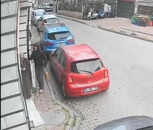 Görüntülerde, binanın önünde elinde telefonla bekleyen kadına yavaş adımlarla yaklaşan şüphelinin sokakta bir süre keşif yaptığı, ardından kadının dalgınlığından faydalanarak telefonu kapıp hızla uzaklaştığı görülüyor. (DHA)