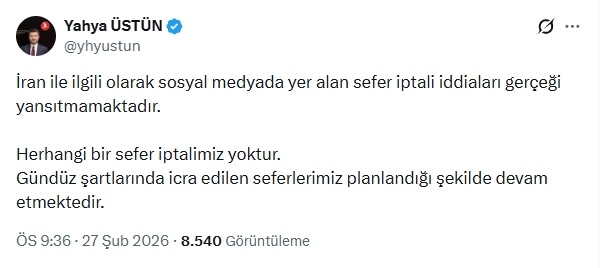 THY İletişim Başkanı Yahya Üstün, sana medya hesabından yaptığı paylaşımda, “İran ile ilgili olarak sosyal medyada yer alan sefer iptali iddiaları gerçeği yansıtmamaktadır. Herhangi bir sefer iptalimiz yoktur. Gündüz şartlarında icra edilen seferlerimiz planlandığı şekilde devam etmektedirö ifadelerini kullandı. (DHA)