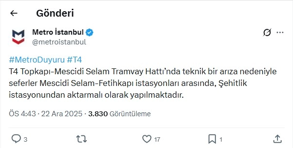 Konuya ilişkin Metro İstanbul'dan yapılan açıklamada, "T4 Topkapı-Mescidi Selam Tramvay Hattı’nda teknik bir arıza nedeniyle seferler Mescidi Selam-Fetihkapı istasyonları arasında, Şehitlik istasyonundan aktarmalı olarak yapılmaktadır" ifadeleri kullanıldı. (DHA)