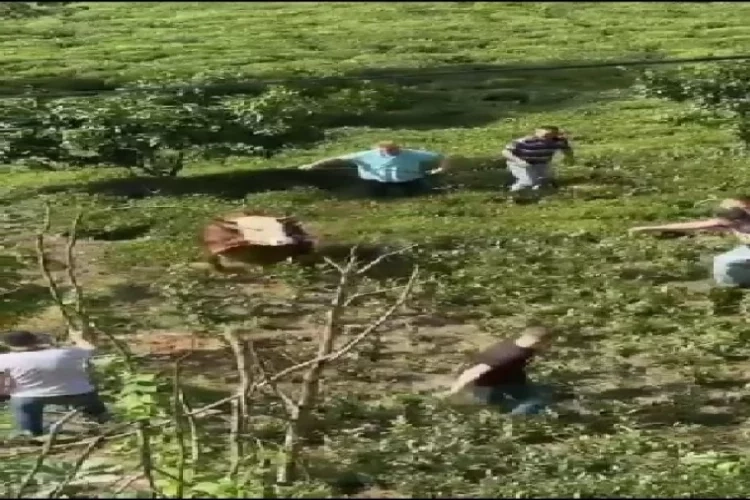 Mehmet Can PEÇE/İYİDERE (Rize), (DHA)- RİZE'nin İyidere ilçesinde kesim öncesi kaçıp, arazide çay bahçesine giren boğa, sahiplerine zor anlar yaşattı. Sahiplerinin boğayı yakalamaya çalıştığı anlar, cep telefonu kamerasıyla görüntülendi. İlçede ortak satın alınan kurbanlık boğa, sahipleri tarafından kesim için ahırdan çıkarılırken kaçtı. Çay bahçesine giren boğayı sakinleştiremeyen sahipleri, Rize İl Özel İdare ekiplerinden yardım istedi. Adrese gelen ekipler, boğayı iğne ile sakinleştirdi. O anlar cep telefonu kamerasıyla kayda alındı. (DHA)