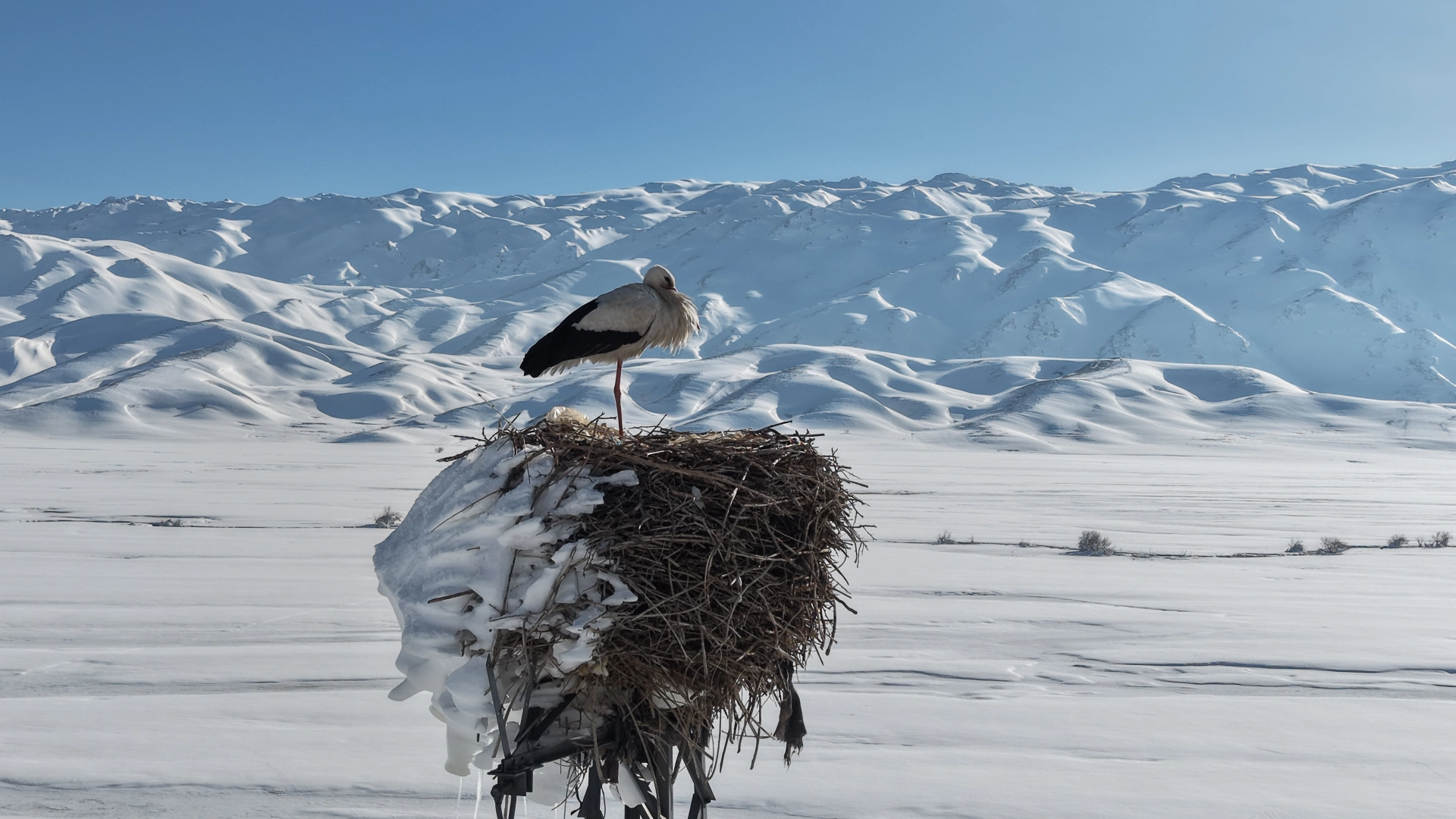 Kışın en sert geçtiği, hava sıcaklığının sıfırın altında seyrettiği Yüksekova'da etkili olan kar yağışı, geniş bir alanı kaplayan ovayı tamamen beyaz örtüyle kapladı. Dron ile kaydedilen görüntülerde, kar altındaki araziler ve buz tutan alanlar yer aldı. Görüntülerde ayrıca, kış mevsiminde elektrik direği üzerine yuva kurduğu görülen leylek de dikkat çekti. Karla kaplı ovada kısmen buz tutmuş yuvasında bekleyen leylek, kış manzarasıyla birlikte farklı bir görüntü sundu. (DHA)