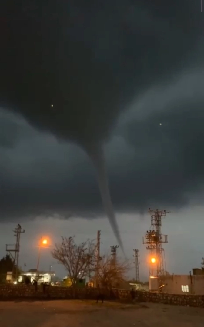 Kızıltepe ilçe merkezinde akşam saatlerinde kısa süreli etkili olan sağanak yağış öncesi hortum çıktı. Hortumun oluştuğu anlar, çevredeki bir kişi tarafından cep telefonu kamerasıyla kaydedildi. (DHA)