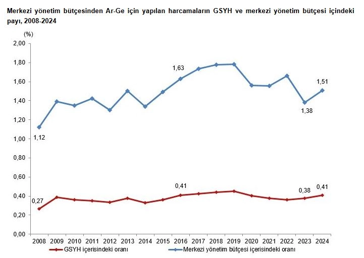 ANKARA, (DHA)-TÜRKİYE İstatistik Kurumu (TÜİK), merkezi yönetim bütçesinden araştırma ve geliştirme (Ar-Ge) faaliyetleri için yapılan harcamanın 2024'te 178 milyar 580 milyon liraya yükseldiğini açıkladı.TÜİK, merkezi yönetim bütçesinden Ar-Ge faaliyetleri için ayrılan ödenek ve harcama istatistiklerini açıkladı. Buna göre; 2023'te merkezi yönetim bütçesinden Ar-Ge faaliyetleri için 98 milyar 737 milyon lira harcanırken, 2024 yılında bu harcama 178 milyar 580 milyon TL oldu. 2024 yılında merkezi yönetim bütçesinden yapılan Ar-Ge harcamalarının merkezi yönetim bütçesi içerisindeki oranı yüzde 1,51 olarak kayıtlara geçti. Merkezi yönetim bütçesinden yapılan Ar-Ge harcamalarının 43 trilyon 410 milyar 514 milyon TL olan gayrisafi yurt içi hasıla (GSYH) içerisindeki oranı yüzde 0,41 oldu. Bütçe başlangıç ödenekleri esas alınarak hesaplanan tahmini sonuçlara göre; 2025 yılı merkezi yönetim bütçesinden Ar-Ge faaliyetleri için 236 milyar 262 milyon TL tahsis edildi. EN FAZLA FONLAMA ÜNİVERSİTELEREAr-Ge için merkezi yönetim bütçesinden yapılan harcamalar sosyoekonomik hedeflere göre; sınıflandırıldığında 2024 yılında en fazla Ar-Ge fonlaması, yüzde 68,3 ile genel bilgi gelişimi için üniversitelere yapıldı. Bu sosyoekonomik hedefi; sırasıyla yüzde 9,3 ile endüstriyel üretim ve teknoloji, yüzde 5,2 ile genel bilgi gelişimi (diğer kaynaklardan finanse edilen), yüzde 4,3 ile tarım ve yüzde 4 ile savunma takip etti. Bütçe başlangıç ödenekleri esas alınarak yapılan hesaplamalara göre; 2025 yılında Ar-Ge için en fazla ödeneğin yüzde 69,5 ile genel bilgi gelişimi için üniversitelere ayrılacağı tahmin edildi. Endüstriyel üretim ve teknoloji, sosyoekonomik hedefler arasında yüzde 7,9 ile ikinci sırada yer aldı. Bunu yüzde 5,4 ile genel bilgi gelişimi (diğer kaynaklardan finanse edilen), yüzde 4,8 ile tarım ve yüzde 3,6 ile savunma izledi.KAMU FONU İLK SIRADA YER ALDIMerkezi yönetim bütçesinden uluslararası Ar-Ge programlarına 2024 yılında 1,03 milyar TL ayrıldı. Ar-Ge programlarının alt kategorilerine göre; uluslararası Ar-Ge faaliyeti yürüten kuruluşlara gönderilen kamu fonu 461 milyon TL ile ilk sırada yer aldı. Bunu 367 milyon TL ile ikili veya çok taraflı kamu Ar-Ge programları için fonlar ve 202 milyon TL ile Avrupa çapında yürütülen Ar-Ge programları takip etti. Bütçe başlangıç ödeneğine göre uluslararası Ar-Ge programlarına 2025 yılında 1,17 milyar TL tahsis edildi. İlk sırayı 500 milyon TL ile ikili veya çok taraflı uluslararası Ar-Ge programları alırken, bunu 475 milyon TL ile uluslararası Ar-Ge faaliyeti yürüten kuruluşlara ait fonlar ve 198 milyon TL ile Avrupa çapında yürütülen Ar-Ge programları izledi. (DHA)