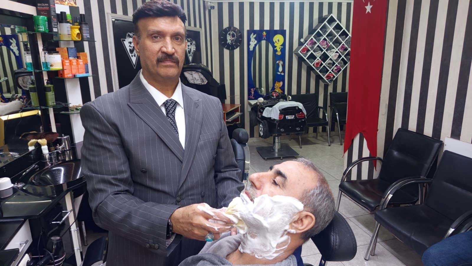 Ferhat DERVİŞOĞLU-Cuma Yunus YAŞATIR/REYHANLI (Hatay), (DHA)- HATAY’ın Reyhanlı ilçesinde 47 yıllık berber Selahattin Aslan (56), 5 yıldır müşterilerini takım elbise ile tıraş ediyor.