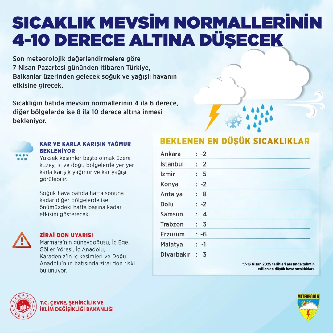 ANKARA, (DHA)- METEOROLOJİ Genel Müdürlüğü, pazartesi gününden itibaren Balkanlar üzerinden gelecek soğuk ve yağışlı havanın etkili olacağını, hava sıcaklıkların mevsim normallerinin 4 ila 10 derece arasında düşeceğini açıkladı.Çevre, Şehircilik ve İklim Değişikliği Bakanlığı'na bağlı Meteoroloji Genel Müdürlüğü'nün son meteorolojik değerlendirmelerine göre; Türkiye 7 Nisan Pazartesi gününden itibaren Balkanlar üzerinden gelecek soğuk ve yağışlı havanın etkisine girecek. Mevsim normalleri civarında seyreden hava sıcaklıkları, yarından itibaren kuzeybatı kesimlerden başlayarak yurt genelinde azalacak. Sıcaklığın batı kesimlerde mevsim normallerinin 4 ila 6 derece, diğer bölgelerde ise 8 ila 10 derece altına inmesi bekleniyor. Soğuk havanın, yurdun batısında hafta sonuna kadar, doğusunda ise önümüzdeki hafta başına kadar etkili olacağı tahmin ediliyor. Soğuk havayla birlikte, yüksek kesimler başta olmak üzere kuzey, iç ve doğu bölgelerde yer yer karla karışık yağmur ve kar yağışlarının görülmesi bekleniyor. ZİRAİ DON UYARISIGece sıcaklıklarında ani düşüşe bağlı olarak tarımsal faaliyetlerin devam ettiği Marmara'nın güneydoğusu, İç Ege, Göller Yöresi, İç Anadolu, Karadeniz'in iç kesimleri ve Doğu Anadolu'nun batısında zirai don riski bulunuyor. Yaşanabilecek olumsuzluklara karşı Meteoroloji'nin tahmin ve erken uyarıların takip edilmesi gerekiyor. En düşük hava sıcaklıklarının ise Ankara'da eksi 2, İstanbul'da 2, İzmir'de 5, Konya'da eksi 2, Antalya'da 8, Bolu'da eksi 2, Samsun'da 4, Trabzon'da 3, Erzurum'da eksi 6, Malatya'da eksi 1, Diyarbakır'da 3 derece olması bekleniyor. (DHA)