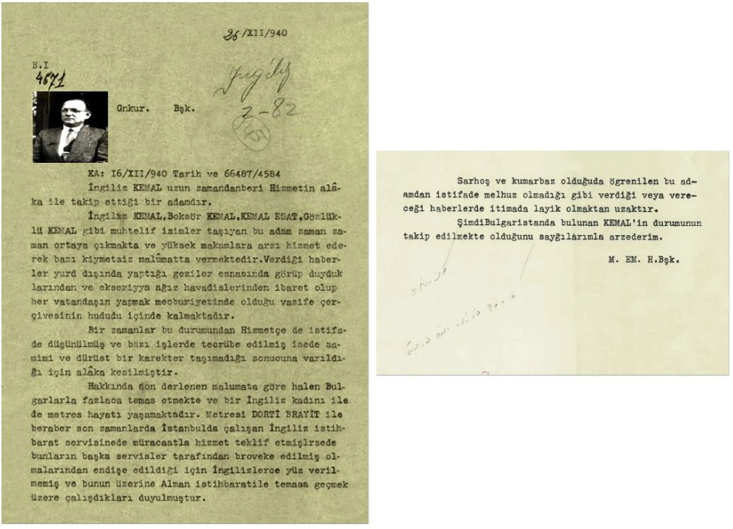 "İngiliz Kemal uzun zamandan beri Hizmetin alaka ile takip ettiği bir adamdır. 'İngiliz Kemal', 'Boksör Kemal', 'Kemal Esat', 'Gözlüklü Kemal' gibi muhtelif isimler taşıyan bu adam zaman zaman ortaya çıkmakta ve yüksek makamlara arzı hizmet ederek bazı kıymetsiz malumatlar vermektedir. Verdiği haberler yurt dışında yaptığı geziler esnasında görüp duyduklarından ve ekseriya ağız havadislerinden ibaret olup her vatandaşın yapmak mecburiyetinde olduğu vazife çerçevesinin hududu içinde kalmaktadır. Bir zamanlar bu durumundan Hizmetçe de istifade düşünülmüş ve bazı işlerde tecrübe edilmişse de samimi ve dürüst bir karakter taşımadığı sonucuna varıldığı için alaka kesilmiştir. Hakkında dün derlenen malumata göre, halen Bulgarlarla fazlaca temas etmekte ve bir İngiliz kadını ile de metres hayatı yaşamaktadır. Metresi Dorti Brayit ile beraber son zamanlarda İstanbul'da çalışan İngiliz İstihbarat Servisi'ne de müracaatla hizmet teklif etmişlerse de bunların başka servisler tarafından provoke edilmiş olmalarından endişe edildiği için İngilizlerce yüz verilmemiş ve bunun üzerine Alman istihbaratı ile temasa geçmek üzere çalıştıkları duyulmuştur. Sarhoş ve kumarbaz olduğu da öğrenilen bu adamdan istifade melhuz olmadığı gibi verdiği veya vereceği haberler de itimada layık olmaktan uzaktır. Şimdi Bulgaristan'da bulunan Kemal'in durumunun takip edilmekte olduğunu saygılarımla arz ederim."