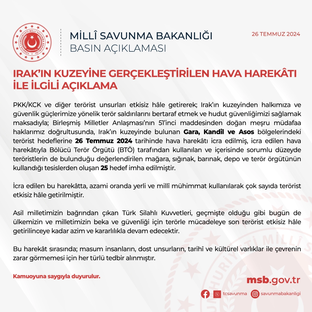 Salih HÜDAVERDİ/ ANKARA, (DHA)- MİLLİ Savuma Bakanlığı, Irak’ın kuzeyinde Gara, Kandil ve Asos bölgelerindeki terörist hedeflerine hava harekatı düzenlendiğini ve 25 hedefin imha edildiğini bildirdi.Milli Savunma Bakanlığı (MSB) sosyal medya hesabından yapılan açıklamaya göre, PKK/KCK ve diğer terörist unsurları etkisiz hale getirerek Irak’ın kuzeyinden Türkiye’ye yönelik saldırıları bertaraf etmek ve hudut güvenliği sağlamak amacıyla Birleşmiş Milletler Anlaşması’nın 51’inci maddesinden doğan meşru müdafaa hakkı doğrultusunda Irak’ın kuzeyinde bulunan Gara, Kandil ve Asos bölgelerindeki terörist hedeflerine hava harekatı düzenlendi. Düzenlenen hava harekatıyla Bölücü Terör Örgütü (BTÖ) tarafından kullanılan ve içerisinde sorumlu düzeyde teröristlerin de bulunduğu değerlendirilen mağara, sığınak, barınak, depo ve terör örgütünün kullandığı tesislerden oluşan 25 hedef imha edildi. Bakanlıktan yapılan açıklamada terörle mücadelede kararlılık vurgusu yapılarak, “Asil milletimizin bağrından çıkan Türk Silahlı Kuvvetleri, geçmişte olduğu gibi bugün de ülkemizin ve milletimizin beka ve güvenliği için terörle mücadeleye son terörist etkisiz hâle getirilinceye kadar azim ve kararlılıkla devam edecektir. Bu harekat sırasında; masum insanların, dost unsurların, tarihî ve kültürel varlıklar ile çevrenin zarar görmemesi için her türlü tedbir alınmıştır” ifadeleri kullanıldı. (DHA)