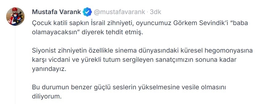 İSTANBUL, (DHA)- MECLİS Sanayi, Ticaret, Enerji, Tabii Kaynaklar, Bilgi ve Teknoloji Komisyonu Başkanı ve AK Parti Bursa Milletvekili Mustafa Varank’tan Eşref Rüya dizisinde 'Kadir Baba’yı oynayan Görkem Sevindik’e güçlü bir destek geldi. Komisyon Başkanı Varank, Sevindik’in Filistin meselesinde vicdani ve yürekli bir tutun sergilediğini vurgulayarak “Bu durumun benzer güçlü seslerin yükselmesine vesile olmasını diliyorum” dedi.
