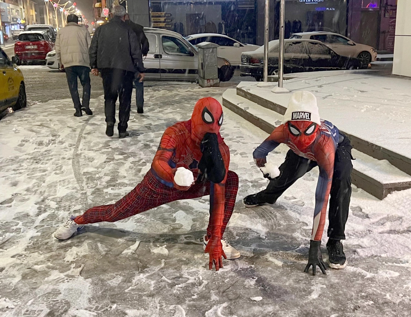 Muzaffer KOŞAN/ERZİNCAN, (DHA)- TÜRKİYE'yi gezme hayaliyle memleketi İzmir'den 'Örümcek Adam' kostümüyle yola çıkan Ayaz Salih Koç (25), 62'nci durağı olan Erzincan'da kendisi gibi 'Örümcek Adam' kostümüyle dolaşan Asaf Özdemir (16) ile karşılaştı. Taraflar kısa süreli şaşkınlığın ardından yağan lapa lapa kar altında kar topu savaşı yaptı, ardından da birbirine sarıldı. İzmir'de yaşayan Ayaz Salih Koç, 6 Şubat depremlerinin ardından gönüllü olarak bölgeye gitti. Yanında götürdüğü 'Örümcek Adam' kostümüyle çocukları eğlendiren Koç, bölgedeki depremzedelere yönelik yardım faaliyetlerinde görev aldı. Deprem bölgesinde yaşadığı olay sonrası giydiği pijama nedeniyle 'Yerli Pijamalı Örümcek Adam' olarak anılmaya başlayan Koç, bölgeden ayrıldıktan sonra da Türkiye'yi dolaşmaya karar verdi.Otostopla bir yılı aşkın süredir Türkiye'yi dolaşan ve gittiği yerleri sosyal medyada paylaşımlar yaparak tanıtmaya çalışan Ayaz Salih Koç, bugüne kadar 61 ili ziyaret etti. Koç, 62'nci şehir olarak geldiği Erzincan'da, kendisi gibi 'örümcek Adam' kostümü ile gezen Asaf Özdemir ile karşılaştı. İkili kısa bir şaşkınlığın ardından yağan lapa lapa kar altında kar topu savaşı yaptı. Çevredekilerin ilginç bakışları altında birbirine kar topu atan Koç ve Özdemir, bir süre sonra oyunu bırakıp birbirine sarıldı. 81 ili adım adım gezip tanıtacağını söyleyen Ayaz Salih Koç, Erzincan'da kendisi gibi giyinen biri ile karşılaşmanın sevinci ve heyecanı içinde olduğunu söyledi.Sanayide motor ustası olan babası ile çalıştığını söyleyen Asaf Özdemir ise çok sevdiği çizgi film karakteri 'Örümcek Adam' kostümünü hafta sonu tatillerinde giyerek çocukları eğlendirdiğini ve onları mutlu etmenin sevincini yaşadığını söyledi. Erzincan sokaklarında gezerken kendisi gibi biri ile karşılaşınca çok şaşırdığını belirten Özdemir, "Başladık kar topu savaşı yapmaya. Tabii kar topu oynarken de Örümcek Adam’ın hareketlerini yapmayı ihmal etmedik. Güzel bir buluşma oldu. İzmirli ve Erzincanlı Örümcek Adam olarak halkı az da olsa eğlendirdik" diye konuştu. (DHA)