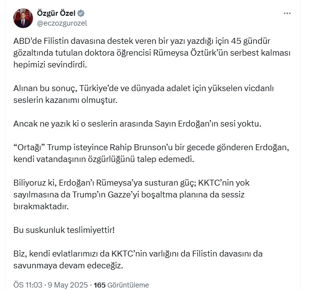ANKARA, (DHA)- CHP Genel Başkanı Özgür Özel, “ABD'de Filistin davasına destek veren bir yazı yazdığı için 45 gündür gözaltında tutulan doktora öğrencisi Rümeysa Öztürk’ün serbest kalması hepimizi sevindirdi” dedi.CHP Genel Başkanı Özgür Özel, sosyal medya hesabından paylaşım yaparak, “ABD'de Filistin davasına destek veren bir yazı yazdığı için 45 gündür gözaltında tutulan doktora öğrencisi Rümeysa Öztürk’ün serbest kalması hepimizi sevindirdi. Alınan bu sonuç, Türkiye’de ve dünyada adalet için yükselen vicdanlı seslerin kazanımı olmuştur. Ancak ne yazık ki o seslerin arasında Sayın Erdoğan’ın sesi yoktu. “Ortağı” Trump isteyince Rahip Brunson’u bir gecede gönderen Erdoğan, kendi vatandaşının özgürlüğünü talep edemedi. Biliyoruz ki, Erdoğan’ı Rümeysa’ya susturan güç; KKTC’nin yok sayılmasına da Trump’ın Gazze’yi boşaltma planına da sessiz bırakmaktadır. Bu suskunluk teslimiyettir. Biz, kendi evlatlarımızı da KKTC’nin varlığını da Filistin davasını da savunmaya devam edeceğiz” ifadelerini kullandı. (DHA)