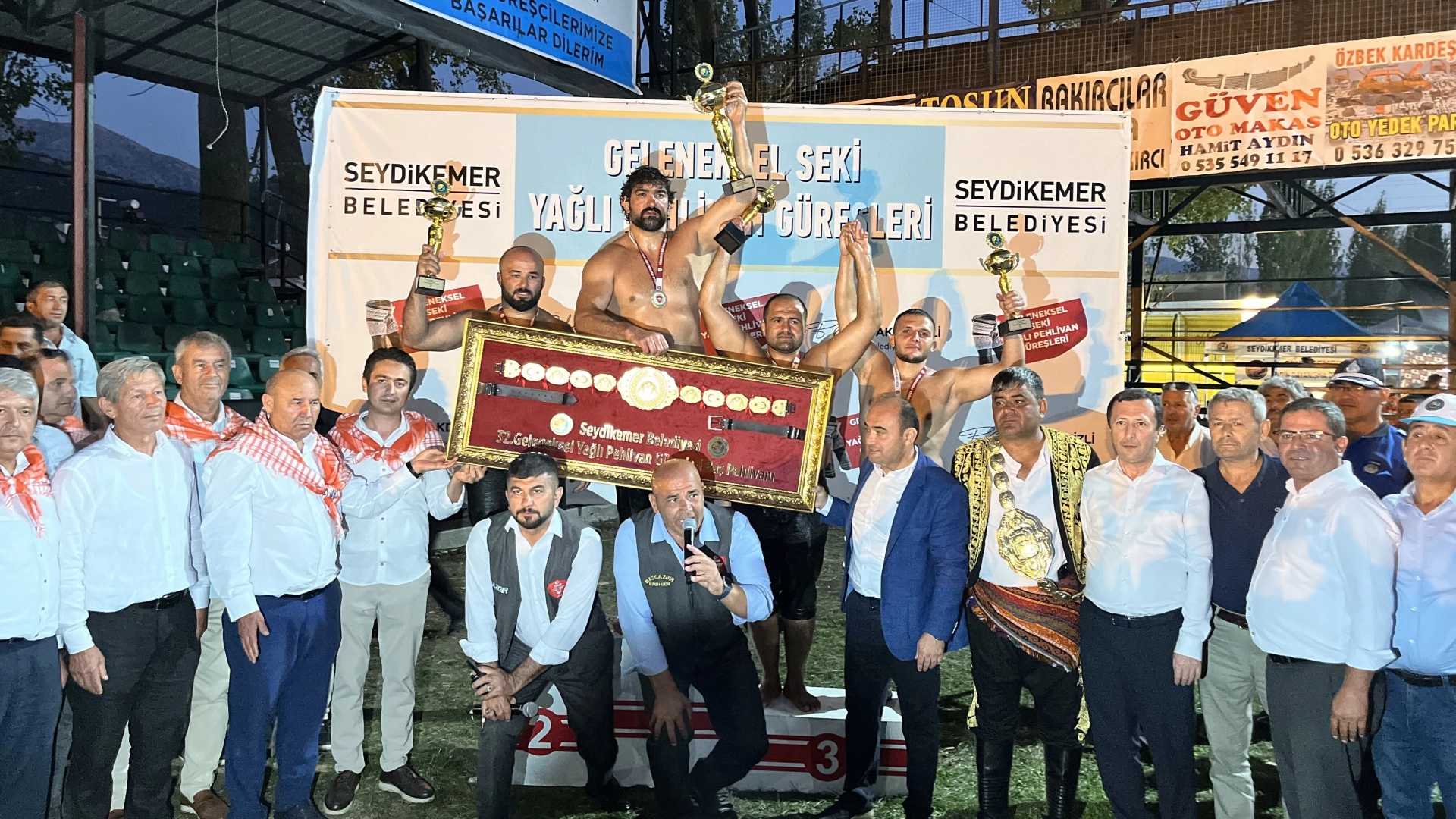 Gülgün AKYOKUŞ/ SEYDİKEMER(Muğla) (DHA)- MUĞLA’nın Seydikemer ilçesinde bu yıl 32’ncisi düzenlenen Geleneksel Seki Yağlı Pehlivan Güreşleri’nde İsmail Koç başpehlivan oldu. Seydikemer ilçesinde bu yıl 32’ncisi düzenlenen etkinliğe Aile ve Sosyal Politikalar eski Bakanı ve AK Parti Genel Başkan Yardımcısı Fatma Betül Sayan Kaya, AK Parti Muğla Milletvekili Yakup Otgöz, Muğla Büyükşehir Belediye Başkanı Ahmet Aras, Seydikemer Kaymakamı Yıldız Büyüker ve çok sayıda vatandaş katıldı. Organizasyona 65 başpehlivan ile birlikte yaklaşık bin pehlivan katıldı. Finalde Orhan Okulu’yu mağlup eden İsmail Koç, 32’nci Seki Yağlı Güreşleri’nin başpehlivanı oldu. (DHAFOTOĞRAFLI