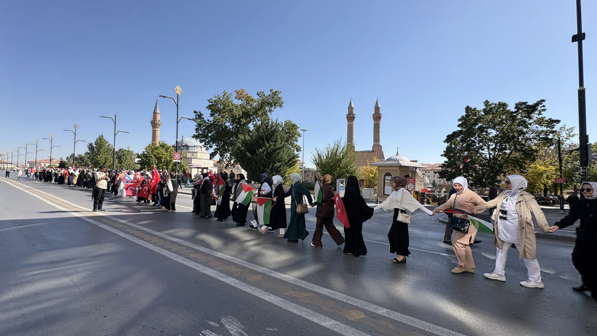 Hüsnü Ümit AVCI-Uğur YİĞİT/SİVAS, (DHA)- SİVAS'ta kadın sivil toplum kuruluşları tarafından ‘Gazze için Sessiz Çığlık’ yürüyüşü düzenlendi. Kadınlar, etkinlikte el ele tutuşarak zincir oluşturdu. İsrail'in Gazze'ye yönelik saldırılarının yıl dönümünde Sivas'ta kadın sivil toplum kuruluşları tarafından Gazze için Sessiz Çığlık’ etkinliği düzenlendi. Sivas Devlet Hastanesi önünde toplanan kadınlar, el ele tutuşarak İnönü Bulvarı’nda zincir oluşturdu. Yaklaşık 1 kilometre uzunluğundaki zincirde kadınlar sessizce ellerinde döviz ve Filistin bayraklarıyla yürüyerek, İsrail'in saldırılarına tepki gösterdi. Cumhuriyet Meydanı'nda son bulan yürüyüşte grup adına basın bildirisini okuyan AK Parti Kadın Kolları Başkanı Ayşegül Hatip, Gazze'nin sessiz çığlığına ses olmak için el ele meydanlarda olduklarını belirterek, "Bugün 81 ilde kurduğumuz bu zincir, Gazze’de evlatlarını kaybeden anne-babaların zinciridir, öksüz-yetim bırakılan çocukların zinciridir. Biz bugün bütün kimliklerimizden sıyrılarak sadece kadın kimliğimizle buradayız. Çünkü bu mesele ne dünyadaki rollerimizle ne taşıdığımız ünvanlarla ne de sahip olduklarımızla ilgilidir. Bu mesele insanlık meselesidir. Bugün Türkiye’den tüm dünyaya tek bir şey söylüyoruz. Barış kadınla mümkündür. Slogan atmıyoruz, vicdanlarımızla haykırıyoruz. Çünkü bazı sessizlikler vardır ki arşı yere indirir. Bizim sessizliğimiz Gazze’nin en gür çığlığı olacaktır" dedi. (DHA)