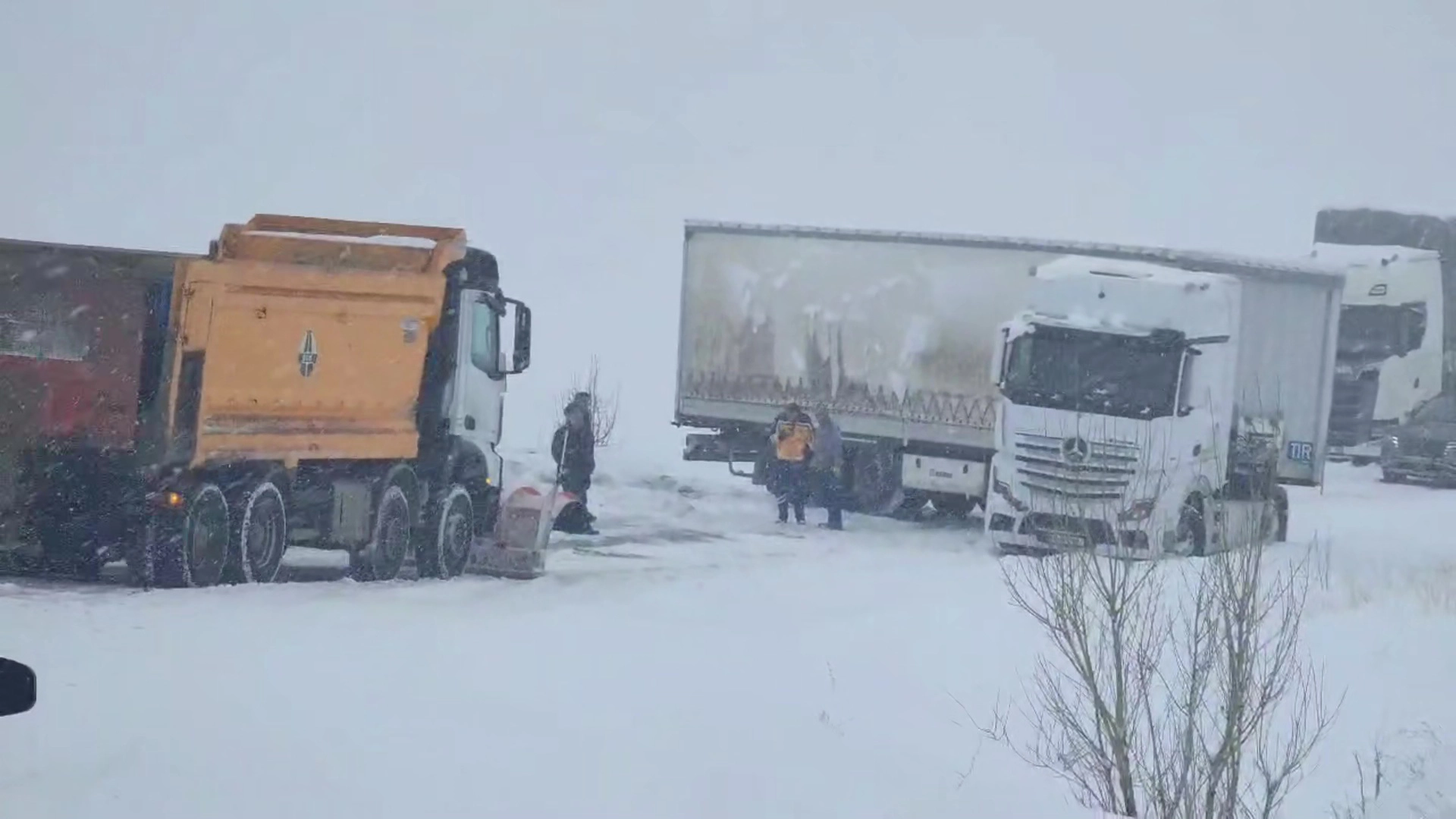 MAKASLAYAN TIR’I ÇEKİP YOLU AÇTILARSivas'ın Suşehri ile Zara ilçeleri arasındaki Geminbeli Geçidi'nde gece saatlerinde başlayan kar yağışı, etkisini sürdürüyor. Geçide yakın noktadaki Kumoğlu mevkisinde, kar yağışıyla birlikte yüksek tonajlı araçların sürücüleri zorluk yaşadı. Bir TIR makaslayarak yolu kapattı. Bölgede tuzlama ve küreme çalışması yapan Karayolları ekipleri, kayan TIR'ı halatla çekip yolu yeniden ulaşıma açtı. Bölgede ulaşımın aksamaması için ekiplerin çalışmaları devam ediyor. (DHA)Oğuzhan ÇİFCİ/SUŞEHRİ(Sivas), (DHA)