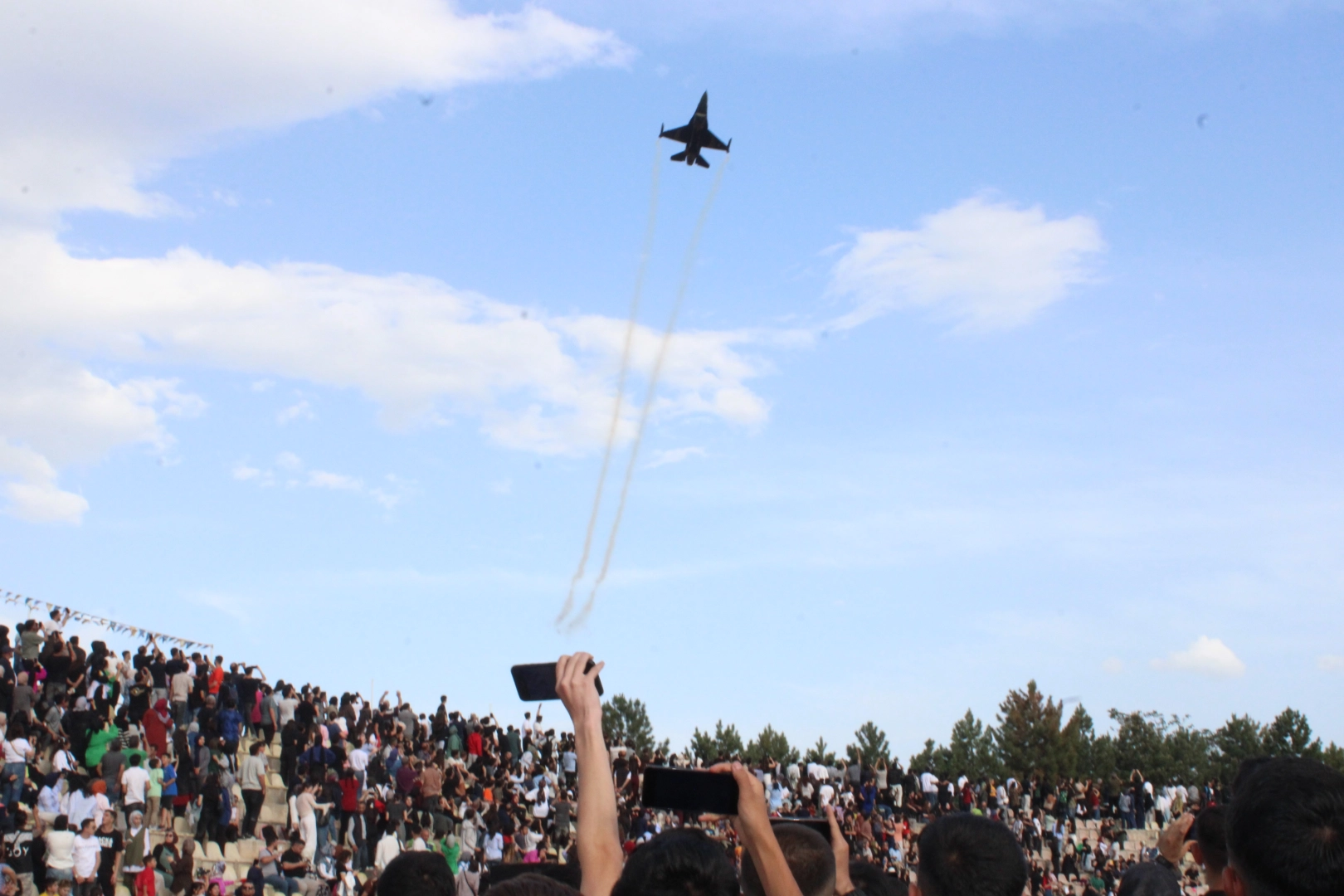 Recep BAĞDAT/ MALATYA, (DHA)- TÜRK Hava Kuvvetlerinin akrobasi timi SOLOTÜRK Malatya'da gösteri uçuşu gerçekleştirdi.Türk Hava Kuvvetleri SOLOTÜRK, İnönü Üniversitesi'nin 50'nci kuruluş yıldönümü dolayısı ile Malatya'da gösteri uçuşu gerçekleştirdi. 7'nci Ana Jet Komutanlığı'ndan havalanan SOLOTÜRK ekibi üniversite yerleşkesindeki stadyum üzerinden geçerek akrobatik hareketler sergiledi. Gösteriyi Malatya Valisi Seddar Yavuz, Malatya Büyükşehir Belediye Başkanı Sami Er, 2'inci Ordu Kurmay Başkanı Garnizon Komutanı Tüm General Erman Kiraz, İl Jandarma Komutanı Tolunay Başer ile birlikte bazı kurum müdürleri ve yaklaşık 20 bin vatandaş ilgi ile takip etti. Gökyüzünde akrobatik gösteriler sergileyen SOLOTÜRK ekibinin gösterisini izleyen vatandaşlar cep telefonları ile anı ölümsüzleştirdi. (DHA)FOTOĞRAFLI