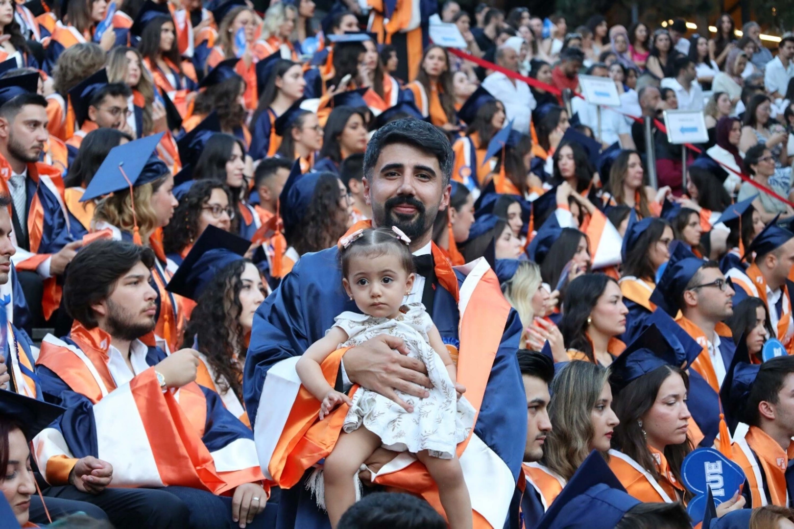 Nevra UÇKAÇ/İZMİR, (DHA)- DENİZLİ Devlet Hastanesi'nde sosyal hizmetler uzmanı olarak çalışan Şahin Çakar (32), çocukluğundan beri hayalini kurduğu hukuk fakültesi diplomasını, kucağındaki 15 aylık kızı Sofya Çakar ile birlikte aldı. Şahin Çakar, "Eşim doktora tezini teslim ederken kızımız kucağındaydı. Bütün güzel anlara şahit oldu" dedi.Kocaeli Üniversitesi Sosyal Hizmetler Bölümü'nden mezun olan Şahin Çakar, 2015 yılında Aile ve Sosyal Hizmetler Bakanlığı'na atanıp, İzmir İl Müdürlüğü'nde çalışmaya başladı. Ancak çocukluk hayali avukat olmak isteğinden hiç vazgeçmediğini belirten Çakar, 2018 yılında üniversite sınavına girip, İzmir Ekonomi Üniversitesi Hukuk Fakültesi'ne kayıt yaptırdı. Önceliğinin hukuk eğitimi olduğunu dile getiren Çakar, çalışma hayatını sonlandırmak zorunda kaldı. Pandemi başlayınca Sağlık Bakanlığı tarafından göreve çağrılan Çakar, bu kez Denizli Devlet Hastanesi'nde sosyal hizmet uzmanı olarak çalışmaya başladı. Çakar, 2020 yılında, hayatını Nottingham Üniversitesi'nde klinik psikoloji bölümünde yüksek lisans ve doktorasını tamamlayan Fatma Çakar ile birleştirdi. Hem çalışıp hem İzmir Ekonomi Üniversitesi Hukuk Fakültesi'ndeki eğitimini bitiren Çakar, mezuniyet törenine 15 aylık kızı Sofya Çakar ve eşi Fatma Çakar ile birlikte katıldı.'21 KİŞİYDİK, 18'İ AVUKAT OLDU'Hukuk fakültesine kayıt yaptırmak için ilk 100 bine girme koşulu olduğunu ve ilk 40 bine girerek iyi bir sıralama elde ettiğini ifade eden Şahin Çakar, küçüklüğünden beri hukuk okumak istediğini belirtip, "Lisedeki sınıfımda 21 kişiydik, 18'i avukat oldu. O dönem onlardan geride kaldım. Sosyal hizmet bölümünü kazandım ama içimde uhde kalmıştı. Bütün çevrem avukattı. Onlar gibi olmak istiyordum" dedi.'ONUN DA AVUKAT OLMASINI İSTİYORUM'Çakar, "2020'de Denizli'de göreve başladığımda yeni evlenmiştik. Eşim yüksek lisans ve doktor bursiyeri olarak yurt dışına gitti. Eş durumuyla memur olarak ücretsiz izin aldım ve eşimin yanına gittim. Yaklaşık 1,5 sene İngiltere'de yaşadım. Eşim Nottingham Üniversitesi'nde klinik psikoloji doktorasını yaptı. Anne ve babasının tüm özel anlarına şahitlik eden Sofya, 17 Temmuz'da da annesinin İngiltere'deki mezuniyet törenine katılacak. Eşim daha sonra Dokuz Eylül Üniversitesi'nde göreve başlayacak. Eşim doktora tezini teslim ederken kızımız kucağındaydı. Bütün güzel anlara şahit oldu. Onun göbek bağını Cambridge Üniversitesi Hukuk Fakültesi'ne gömmüştüm. Çünkü ileride onun da avukat olmasını istiyorum. Belki olur. Stajımı tamamlayıp, ofisimi açacağım. İkinci kez işimden istifa edeceğim" diye konuştu. (DHA)