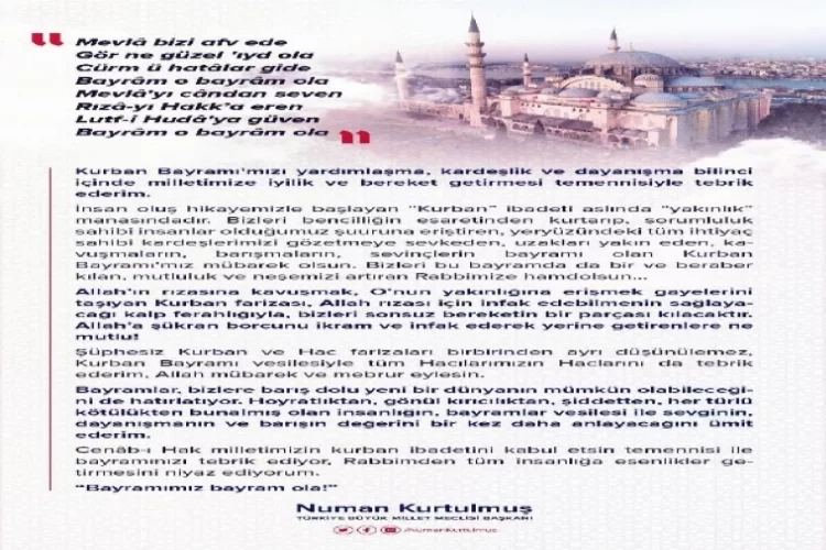 ANKARA, (DHA)- TBMM Başkanı Numan Kurtulmuş, "Bizleri bencilliğin esaretinden kurtarıp, sorumluluk sahibi insanlar olduğumuz şuuruna eriştiren, yeryüzündeki tüm ihtiyaç sahibi kardeşlerimizi gözetmeye sevk eden, uzakları yakın eden, kavuşmaların, barışmaların, sevinçlerin bayramı olan Kurban Bayramı’mız mübarek olsun" dedi. TBMM Başkanı Kurtulmuş, Kurban Bayramı vesilesi ile Twitter hesabından tebrik mesajı yayımladı. Kurtulmuş, Alvarlı Muhammed Lütfi Efendi'nin 'Can Bula Cananını Bayram O Bayram Ola' şiirinden bir kesit paylaşarak, "Kurban Bayramı'mızı yardımlaşma, kardeşlik ve dayanışma bilinci içinde milletimize iyilik ve bereket getirmesi temennisiyle tebrik ederim. İnsan oluş hikayemizle başlayan kurban ibadeti, aslında yakınlık manasındadır. Bizleri bencilliğin esaretinden kurtarıp, sorumluluk sahibi insanlar olduğumuz şuuruna eriştiren, yeryüzündeki tüm ihtiyaç sahibi kardeşlerimizi gözetmeye sevk eden, uzakları yakın eden, kavuşmaların, barışmaların, sevinçlerin bayramı olan Kurban Bayramı'mız mübarek olsun. Bizleri bu bayramda da bir ve beraber kılan, mutluluk ve neşemizi artıran rabbimize hamdolsun. Allah'ın rızasına kavuşmak, O'nun yakınlığına erişmek gayelerini taşıyan kurban farizası, Allah rızası için infak edebilmenin sağlayacağı kalp ferahlığıyla, bizleri sonsuz bereketin bir parçası kılacaktır. Allah'a şükran borcunu ikram ve infak ederek yerine getirenlere ne mutlu" ifadelerini kullandı. 'BAYRAMLAR BARIŞ DOLU, YENİ BİR DÜNYANIN OLABİLECEĞİNİ DE HATIRLATIYOR' Kurban ve hac farizalarının birbirinden ayrı düşünülemeyeceğini kaydeden Kurtulmuş, "Kurban Bayramı vesilesiyle tüm hacılarımızın haclarını da tebrik ederim. Allah mübarek ve mebrur eylesin. Bayramlar, bizlere barış dolu yeni bir dünyanın mümkün olabileceğini de hatırlatıyor. Hoyratlıktan, gönül kırıcılıktan, şiddetten, her türlü kötülükten bunalmış olan insanlığın, bayramlar vesilesi ile sevginin, dayanışmanın ve barışın değerini bir kez daha anlayacağını ümit ederim. Cenab-ı Hak milletimizin kurban ibadetini kabul etsin temennisi ile bayramınızı tebrik ediyor, Rabbimden tüm insanlığa esenlikler getirmesini niyaz ediyorum. 'Bayramımız bayram ola'" mesajını paylaştı. (DHA)