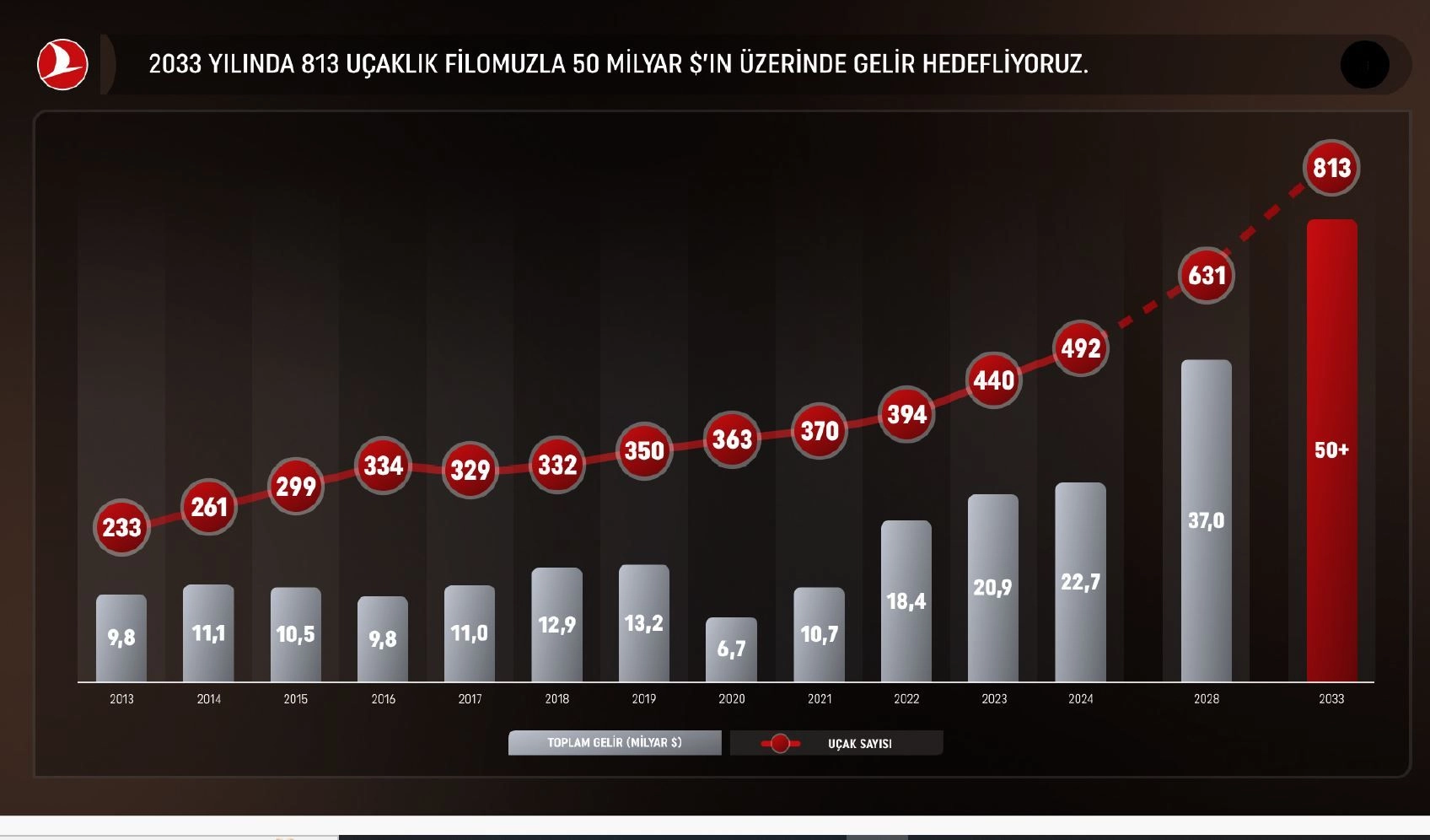 İbrahim YILDIZ/İSTANBUL, (DHA) - DÜNYANIN en çok noktasına uçan havayolu şirketi olan Türk Hava Yolları’nın (THY) 500’üncü uçağının 2025 yılında filoya katılacağı açıklandı. THY Genel Müdürü Bilal Ekşi, sosyal medya hesabından yaptığı paylaşımda 2033 yılı hedefleri doğrultusunda 813 uçaklık filo ve 50 milyar doların üzerinde gelir hedeflediklerini açıkladı. Ekşi’nin paylaştığı grafikte şirketin büyüme hedefleri yer aldı. Hedefler doğrultusunda 2028 yılında 37 milyar dolarlık bir gelir beklenirken, uçak filosunun 631’e yükselmesi ön görüldü. THY YÜKSEKTEN UÇUYOREkşi yaptığı paylaşımda, “2025’de 500’üncü uçağımız geliyor. 2003’te uçak sayımız neydi? 65 uçak. Dünyada uçak sayısında 35’nci sırada idik. Şimdi dünyanın 9’uncu sırasındayız. İşte büyüme. Uçak sayımızı ve gelirimizi lütfen grafikten inceleyin. Ne diyoruz? Türkiye büyüyor, THY yüksek uçuyor” ifadelerini kullandı. (DHA)