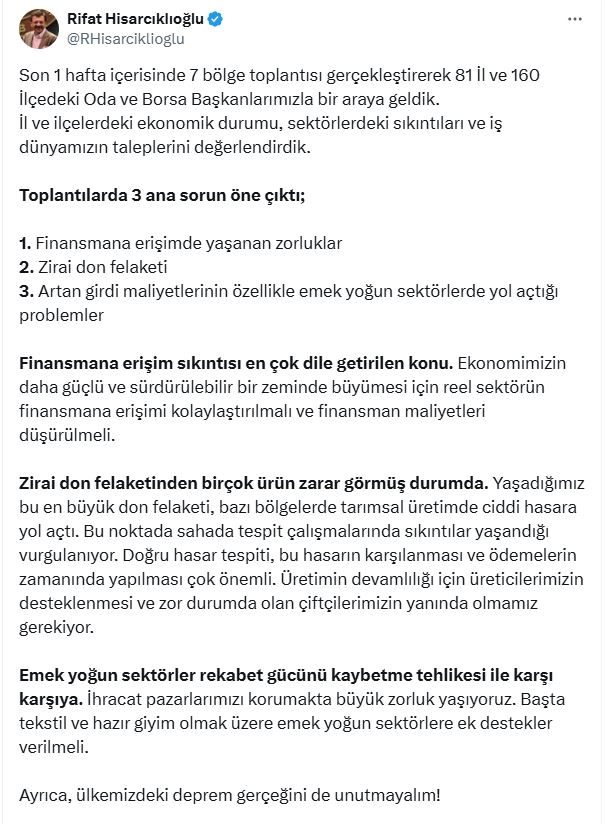 ANKARA, (DHA)- TÜRKİYE Odalar ve Borsalar Birliği (TOBB) Başkanı Rifat Hisarcıklıoğlu, "Ekonomimizin daha güçlü ve sürdürülebilir bir zeminde büyümesi için reel sektörün finansmana erişimi kolaylaştırılmalı ve finansman maliyetleri düşürülmeli" dedi.TOBB Başkanı Rifat Hisarcıklıoğlu, sosyal medya hesabından yaptığı açıklamada, "Son 1 hafta içerisinde 7 bölge toplantısı gerçekleştirerek, 81 il ve 160 ilçedeki oda ve borsa başkanlarımızla bir araya geldik. İl ve ilçelerdeki ekonomik durumu, sektörlerdeki sıkıntıları ve iş dünyamızın taleplerini değerlendirdik. Toplantılarda 3 ana sorun öne çıktı. Finansmana erişimde yaşanan zorluklar, zirai don felaketi, artan girdi maliyetlerinin özellikle emek yoğun sektörlerde yol açtığı problemler. Finansmana erişim sıkıntısı en çok dile getirilen konu. Ekonomimizin daha güçlü ve sürdürülebilir bir zeminde büyümesi için reel sektörün finansmana erişimi kolaylaştırılmalı ve finansman maliyetleri düşürülmeli. Zirai don felaketinden birçok ürün zarar görmüş durumda. Yaşadığımız bu en büyük don felaketi, bazı bölgelerde tarımsal üretimde ciddi hasara yol açtı. Bu noktada sahada tespit çalışmalarında sıkıntılar yaşandığı vurgulanıyor. Doğru hasar tespiti, bu hasarın karşılanması ve ödemelerin zamanında yapılması çok önemli. Üretimin devamlılığı için üreticilerimizin desteklenmesi ve zor durumda olan çiftçilerimizin yanında olmamız gerekiyor" ifadelerini kullandı. Emek yoğun sektörlerin, rekabet gücünü kaybetme tehlikesi ile karşı karşıya olduğunu belirten Hisarcıklıoğlu, "İhracat pazarlarımızı korumakta büyük zorluk yaşıyoruz. Başta tekstil ve hazır giyim olmak üzere emek yoğun sektörlere ek destekler verilmeli. Ayrıca, ülkemizdeki deprem gerçeğini de unutmayalım. Türkiye'nin her il ve ilçesi afete hazır olmalı. Aynı acıları yeniden yaşamamak için güvenli yapılar, depreme dirençli şehirler hemen şimdi" açıklamasında bulundu. (DHA)