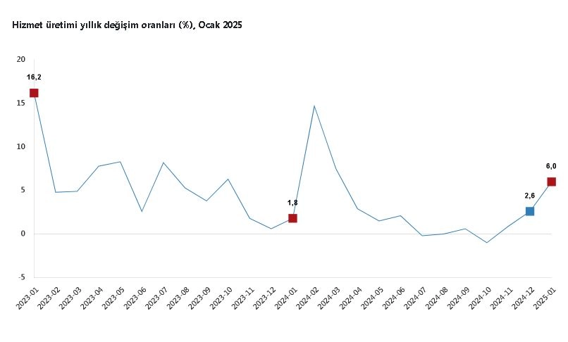 ANKARA, (DHA)- TÜRKİYE İstatistik Kurumu (TÜİK), ocak ayında hizmet üretiminin yıllık yüzde 6, aylık yüzde 2,5 arttığını açıkladı.TÜİK, Ocak 2025 dönemine ilişkin hizmet üretim endeksi verilerini açıkladı. Buna göre; hizmet üretimi bir önceki yılın aynı ayına göre yüzde 6 arttı. Aynı ayda ulaştırma ve depolama hizmetleri yüzde 3,2 arttı, konaklama ve yiyecek hizmetleri yüzde 9,6 arttı, bilgi ve iletişim hizmetleri yüzde 9,9 arttı, gayrimenkul hizmetleri yüzde 8,9 arttı, mesleki, bilimsel ve teknik hizmetler yüzde 7 arttı, idari ve destek hizmetleri ise yüzde 8,2 arttı.Hizmet üretimi bir önceki aya göre yüzde 2,5 arttı. Aynı ayda ulaştırma ve depolama hizmetleri yüzde 0,5 azaldı, konaklama ve yiyecek hizmetleri yüzde 0,5 arttı, bilgi ve iletişim hizmetleri yüzde 6,4 arttı, gayrimenkul hizmetleri yüzde 0,9 azaldı, mesleki, bilimsel ve teknik hizmetler yüzde 12,4 arttı, idari ve destek hizmetleri ise yüzde 4,7 arttı. (DHA)