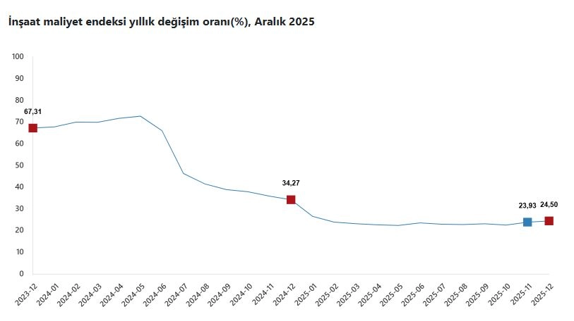 TÜİK, Aralık 2025 dönemine ilişkin inşaat maliyet endeksi verilerini açıkladı. Buna göre, inşaat maliyeti aralık ayında bir önceki aya göre yüzde 1,17 arttı, bir önceki yılın aynı ayına göre yüzde 24,50 arttı. Bir önceki aya göre malzeme endeksi yüzde 1,22 arttı, işçilik endeksi yüzde 1,06 arttı. Ayrıca bir önceki yılın aynı ayına göre malzeme endeksi yüzde 21,47 arttı, işçilik endeksi yüzde 30,67 arttı. Bina inşaatı maliyeti, bir önceki aya göre yüzde 1,52 arttı, bir önceki yılın aynı ayına göre yüzde 24,55 arttı. Bina dışı yapılar için inşaat maliyeti bir önceki aya göre yüzde 0,03 arttı, bir önceki yılın aynı ayına göre yüzde 24,37 arttı. (DHA)