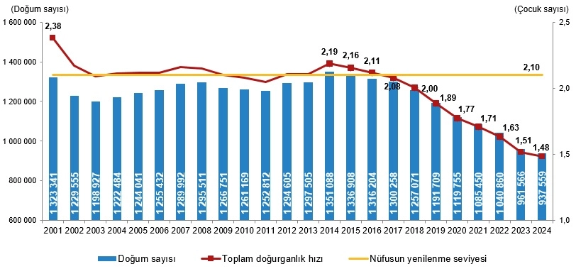 Caner ÜNVER/ANKARA, (DHA)- TÜRKİYE İstatistik Kurumu (TÜİK), 2024 yılında canlı doğan bebek sayısının 937 bin 559 olduğunu, toplam doğurganlık hızının 2014 yılından itibaren düşüş eğilimini sürdürerek 2024 yılında 1,48’e gerilediğini açıkladı. TÜİK, 2024 yılına ilişkin doğum istatistiklerini açıkladı. Buna göre; canlı doğan bebek sayısı bir önceki yıla göre yüzde 2,49 azalarak 2024 yılında 937 bin 559 oldu. Canlı doğan bebeklerin yüzde 51,4'ü erkek, yüzde 48,6'sı kız oldu. Bir kadının doğurgan olduğu dönem olan 15-49 yaş grubunda doğurabileceği ortalama çocuk sayısını ifade eden toplam doğurganlık hızı, 2001 yılında 2,38 çocuk iken 2014 yılından itibaren aralıksız düşüş eğilimine girerek 2024 yılında 1,48 çocuk olarak gerçekleşti. Toplam doğurganlık hızı son 8 yıldır nüfusun yenilenme seviyesi olan 2,10'un altında kalmaya devam etti.DOĞURGANLIK HIZI EN YÜKSEK İL ŞANLIURFA Toplam doğurganlık hızının en yüksek olduğu il 2024 yılında 3,28 çocuk ile Şanlıurfa oldu. Bu ili 2,62 çocuk ile Şırnak, 2,32 çocuk ile Mardin izledi. Toplam doğurganlık hızının en düşük olduğu iller ise 1,12 çocuk ile Bartın ve Eskişehir oldu. Bu illeri 1,15 çocuk ile Zonguldak ve Ankara, 1,17 çocuk ile İzmir takip etti.DOĞURGANLIK HIZI 71 İLDE 2,10'UN ALTINDA KALDIToplam doğurganlık hızının nüfusun yenilenme seviyesinin altına düştüğü 2017 yılında 57 ilin toplam doğurganlık hızı 2,10'un altında iken 2024 yılında 71 ilin toplam doğurganlık hızı bu seviyenin altında kaldı. Toplam doğurganlık hızının 1,50'nin altında kaldığı il sayısı 2017 yılında 4 iken 2024 yılında 55 oldu. Toplam doğurganlık hızı 3 ve üzerinde olan il sayısı 2017 yılında 10 iken 2024 yılında sadece Şanlıurfa oldu.AB'DE TOPLAM DOĞURGANLIK HIZI ORTALAMASI 1,38 Avrupa Birliği (AB) üyesi 27 ülkenin toplam doğurganlık hızları incelendiğinde, 2023 yılında en yüksek toplam doğurganlık hızına sahip ülkenin 1,81 çocuk ile Bulgaristan olduğu, en düşük toplam doğurganlık hızına sahip ülkenin ise 1,06 çocuk ile Malta olduğu görüldü. Toplam doğurganlık hızı 2024 yılında binde 1,48 olan Türkiye, Avrupa Birliği üyesi ülkelerle kıyaslandığında 9'uncu sırada yer aldı.YÜKSEKÖĞRETİM MEZUNU ANNELERİN TOPLAM DOĞURGANLIK HIZI 1,22Annenin eğitim durumuna göre toplam doğurganlık hızı incelendiğinde, 2024 yılında en yüksek toplam doğurganlık hızı okuma yazma bilmeyen/okuma yazma bilen fakat bir okul bitirmeyen anneler için 2,65 çocuk iken en düşük toplam doğurganlık hızı yükseköğretim mezunu anneler için 1,22 çocuk oldu.Kent-kır sınıflamasına göre toplam doğurganlık hızı incelendiğinde, 2024 yılında kır olarak sınıflandırılan yerlerde toplam doğurganlık hızı 1,83 çocuk iken orta yoğun kent olarak sınıflandırılan yerlerde 1,58 çocuk ve yoğun kent olarak sınıflandırılan yerlerde ise 1,39 çocuk oldu.KABA DOĞUM HIZI BİNDE 11Bin nüfus başına düşen canlı doğum sayısını ifade eden kaba doğum hızı, 2001 yılında binde 20,3 iken 2024 yılında binde 11 oldu. Diğer bir ifade ile 2001 yılında bin nüfus başına 20,3 doğum düşerken, 2024 yılında 11 doğum düştü.DOĞURGANLIK HIZI EN YÜKSEK YAŞ GRUBU 25-29 Yaş grubuna göre doğurganlık hızı incelendiğinde, 2001 yılında en yüksek yaşa özel doğurganlık hızı binde 144 ile 20-24 yaş grubunda iken 2024 yılında binde 100 ile 25-29 yaş grubunda görüldü. Bu durum, doğurganlığın kadının daha ileri yaşlarında gerçekleştiğini gösterdi.ADÖLESAN DOĞURGANLIK HIZI DÜŞTÜ15-19 yaş grubunda bin kadın başına düşen ortalama canlı doğan çocuk sayısını ifade eden adölesan doğurganlık hızı, 2001 yılında binde 49 iken 2024 yılında binde 10'a düştü. Diğer bir ifadeyle, 2024 yılında 15-19 yaş grubundaki her bin kadın başına 10 doğum düştü. Annenin son iki doğumu arasındaki ortalama süre incelendiğinde, bu süre 2019 yılında 4,6 yıl iken 2024 yılında 4,7 yıl oldu. 2024 yılında ikinci doğumunu yapan annelerin ilk gerçekleştirdiği doğumu ile bu doğumu arasındaki ortalama süre 4,3 yıl oldu. Doğum yapan annelerden 2024 yılında üçüncü doğumunu gerçekleştirenlerin ikinci doğumu ile arasındaki ortalama süre ise 5,4 yıl oldu.Doğum yapan annelerden 2024 yılında ikinci doğumunu gerçekleştirenlerin birinci doğumu arasındaki ortalama sürenin en uzun olduğu il, 2024 yılında 5,4 yıl ile Kırklareli oldu. Bu ili 5,3 yıl ile Çanakkale, 5,1 yıl ile Kütahya, Edirne, Uşak ve Bartın izledi. Annenin ikinci ile birinci doğumu arasındaki ortalama sürenin en kısa olduğu il, 2024 yılında 2,7 yıl ile Şanlıurfa oldu. Bu ili 2,9 yıl ile Şırnak, 3 yıl ile Ağrı ve Muş izledi.DOĞUM YAPAN ANNELERİN ORTALAMA YAŞI 29,3 Doğumlarını 2001 yılında gerçekleştiren annelerin ortalama yaşı 26,7 iken 2024 yılında 29,3 oldu. İlk doğumunu 2024 yılında gerçekleştiren annelerin ortalama yaşı ise 27,3 oldu. İlk doğumdaki ortalama anne yaşı illere göre incelendiğinde, 2024 yılında ilk doğumda ortalama anne yaşının en yüksek olduğu il 29,4 ile Tunceli oldu. Bu ili 29 yaş ile Artvin, 28,8 yaş ile İstanbul izledi. İlk doğumdaki ortalama anne yaşının en düşük olduğu iller ise 24,4 ile Şanlıurfa ve Muş oldu. Bu illeri 24,5 yaş ile Ağrı, 25,2 yaş ile Gaziantep izledi.DOĞUMLARIN YÜZDE 3,3'Ü ÇOĞUL DOĞUM Çoğul doğum sayısı 2024 yılında 31 bin 109 oldu. Doğumların 2024 yılında yüzde 3,3'ü çoğul doğum olarak gerçekleşirken, bu doğumların yüzde 97'si ikiz, yüzde 2,9'u üçüz ve yüzde 0,1'i dördüz ve daha fazla bebek olarak gerçekleşti. Doğum sırasına göre doğumlar incelendiğinde, 2024 yılında doğumların yüzde 41,9'unun ilk, yüzde 30,3'ünün ikinci,