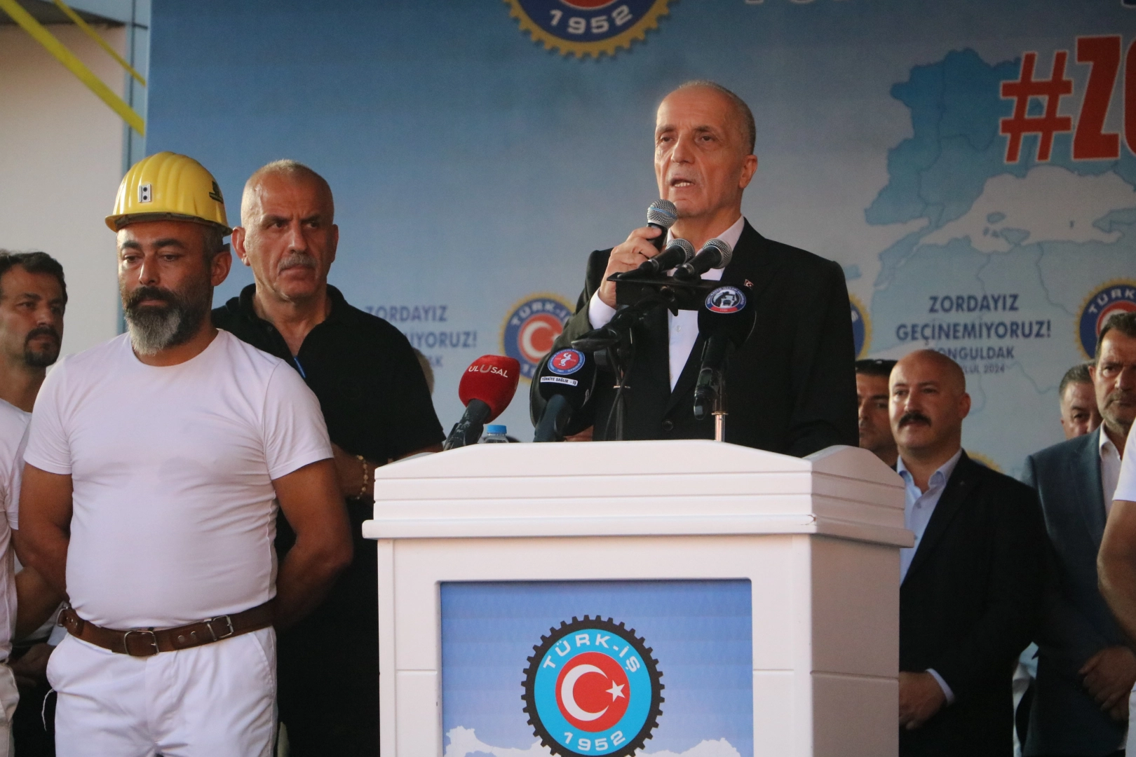 Ali Sencer ARSLAN- Aytaç ÖZTÜRK/ ZONGULDAK, (DHA)- TÜRKİYE İşçi Sendikaları Konfederasyonu (TÜRK-İŞ) tarafından Zonguldak'ta düzenlenen 'Zordayız geçinemiyoruz' mitinginde konuşan Genel Başkan Ergün Atalay, işçinin geçinemediğini belirterek, "Adaletsiz vergi sistemi, işsizlik, kayıt dışı, güvencesiz çalışma sorunu altına ezilmeyeceğiz. Bozulan ekonominin bedelini biz ödemeyeceğiz. Biz iki kelimelik bir şey istiyoruz. İnsan onuruna yaraşır bir talep. Yaşam talep ediyoruz. Han hamam istemiyoruz. Nefes almak istiyoruz. Yaşamak istiyoruz. Ülkeyi yönetenlerin bu sesi duymasını istiyoruz, duydular duydular. Sesi duymayanlar, bu ülkede sandıkta hesabını vermeye devam ederler" dedi.Madenci Anıtı’nda TÜRK-İŞ'e bağlı sendikalar bir araya gelerek ‘Zordayız geçinemiyoruz’ sloganıyla miting düzenledi. Mitinge TÜRK-İŞ Genel Başkanı Ergün Atalay, CHP Genel Başkan Yardımcısı Deniz Yavuzyılmaz, Milletvekili Eylem Ertuğ Ertuğrul ve bazı belediye başkanları ile sivil toplum örgütleri de destek verdi. Atalay’ın konuşmasından önce alanda madenciler ile bir fabrika işçileri arasında yer tartışması yaşandı. Kısa süren arbede sendika yetkililerinin müdahalesi ile sona erdi. Ergün Atalay’ın konuşmaya başladığı esnada ise alkollü olduğu belirtilen bir vatandaş en öne gelerek polis barikatını aşıp alandan çıkmak istedi. Polislerin ve işçilerin çıkışın diğer taraftan yapılacağı söylenen ismi öğrenilemeyen kişi, çevresindekilerle tartışmaya başladı. Bir polisi itmeye çalışan kişiye, işçiler müdahale etti. Önce işçiler tarafından dövülen kişi daha sonra polise teslim edilmesi amacıyla havaya kaldırılarak barikattan atıldı. Polis ekipleri, alkollü vatandaşı gözaltına alarak bölgeden uzaklaştırdı. Öte yandan mitingde Türkiye’nin ilk madenci korosu da katılımcılara konser verdi. ’12 AY ÇALIŞIYORUZ,10 BUÇUK AY MAAŞ ALIYORUZ’Örgütlenildiğinde işten çıkarmalar olduğunu, zam aldığında ‘işçilerin müdür maaşlarını geçti’ denildiğini ifade eden Ergün Atalay, “Bu ülkede memur çok almıyor, işçi az alıyor, işçi yok alıyor. Emekli hiç almıyor. Asgari ücretli aldığı ücretle 1 hafta geçinemiyor. Ülkede 1 yıldır bir kriz yaşıyoruz. 12 ay çalışıyoruz, 10 buçuk ay maaş alıyoruz. Bu adil değil. Bu sürdürülebilir vergi sistemi değil. Ülkeyi yönetenlere sesleniyorum. Bu vergi meselesini bir an evvel gözden geçirin. Dayanma gücümüz kalmadı. Zordayız, geçinemiyoruz.” dedi.‘ÇOK ALANDAN ÇOK AZ ALANDAN AZ VERGİ ALINSIN’Emeklilerin, asgari ücretlilerin aldığı maaşlarla geçinemediklerini söyleyen Atalay, “Asgari ücret öyle bir noktaya geldi ki, bunu kabul etmeniz, kabul etmemiz mümkün değil. Çok alandan çok, az alandan az vergi almak lazım. Aldığımız ücret ortada, 1 ay bu ülkedeki herkes zenginler başta olmak üzere 1 aylık kazançlarını devlete versinler. Biz de zaten yarı aç yarı tok yaşıyoruz bize de 1 ay maaş vermesinler. Madem ülke düzelecekse hadi bakalım, çok alandan çok, az alandan az haydi.” diye konuştu.‘EKMEĞİMİZE NİYE KAN DOĞRUYORSUNUZ’İşten çıkarmalar ve çalışanlara asgari ücret dahi verilmemesini eleştiren Atalay, “Belediyelerde ya çöp topluyoruz ya şoförüz ya çaycıyız Allah aşkına bizden ne istiyorsunuz siz? 3 kuruş para alıyoruz Bizim ekmeğimize niye kan doğruyorsunuz? Hiç fark etmiyor, ülkenin her bölgesinde değişik partilerdeki belediyeler değişiyor işçileri çıkartıyorlar. Bunu kabul etmek doğru değil. İşçilerin vebalini almamak lazım. Yetimin vebalini almamak lazım. Mazlumun vebalini almamak lazım. İki yakanız bir araya gelmez. Onun için biz bu ülkede, işçiler kol kola olacağız. Her meseleyi çözmek için gayret sarf edeceğiz. “ ifadelerini kullandı.‘YAŞAMAK İSTİYORUZ’Ek bir zamma her kesimin ihtiyaç duyduğunu söyleyen Atalay, şöyle konuştu:“Yarın geç olur ama bir an önce halledilmeli. Biz bu ülkede bakan olmayacağız, milletvekili olmayacağız. Benden milletvekili de işveren de olmaz. İşçi başladım burayı bir işçiye devredip gideceğim. Sandığa giderken birbirimizle konuşmadan, temsilcinizle, şube başkanınızla, genel merkezle konuşmadan oy verdiğimiz için bugün kürsülerden sıkıntıları anlatmaya devam ediyoruz. Sendikanızdan bilgi almadan emekli olmayın. 40 puan ne demek, bu kabul edilebilir mi? Onun için bu ucube sistemi bir an evvel düzeltmek gerekiyor. Bu devasa ülke tasarruf genelgesiyle işçinin memurun servisine kaldıysa vay halimize. Sene başında ‘KİT Reformu’ diye bir genelge yayınladılar. Bu genelgenin Türkçesi şu; enerjiyi, ulaştırmayı, madenleri kısa adıyla diyorlar ki, yönetimi 7 yapacağız, 4’ü hazineden olacak, 3’ü kurumdan olacak. Yerin altına girmeyen, direğe çıkmayan, asfalt dökmeyen, kar temizlemeyi bilmeyen yönetime girse kime ne hayır gelir? Sokaktaki enflasyonu biz iyi biliyoruz. TÜİK’in rakamlarına inanmıyoruz. Hayat pahalılığını, Yüksek enflasyonu iliklerimize kadar biz yaşıyoruz. Adaletsiz vergi sistemi, işsizlik, kayıt dışı, güvencesiz çalışma sorunu altına ezilmeyeceğiz. Bozulan ekonominin bedelini biz ödemeyeceğiz. Biz iki kelimelik bir şey istiyoruz. İnsan onuruna yaraşır bir talep. Yaşam talep ediyoruz. Han hamam istemiyoruz. Nefes almak istiyoruz. Yaşamak istiyoruz. Ülkeyi yönetenlerin bu sesi duymasını istiyoruz, duydular duydular. Sesi duymayanlar, bu ülkede sandıkta hesabını vermeye devam ederler." (DHA)