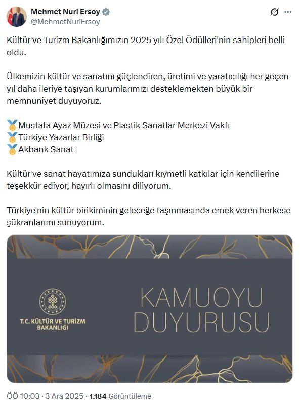 ANKARA, (DHA)- KÜLTÜR ve Turizm Bakanlığı Özel Ödülleri'nin 2025 yılı sahipleri belli oldu. Mustafa Ayaz Müzesi ve Plastik Sanatlar Merkezi Vakfı, Türkiye Yazarlar Birliği ve Akbank Sanat, 2025 yılı Özel Ödülleri'nin sahipleri oldu.