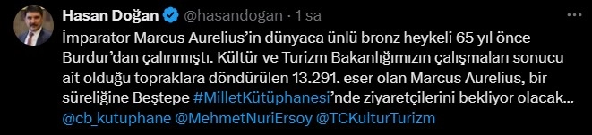 ANKARA, (DHA)- BURDUR'daki Boubon Antik Kenti’nde 1960'lı yıllarda yapılan kaçak kazılar sonucu yurt dışına kaçırılan ve 65 yıl sonra Türkiye'ye iaade edilen Roma İmparatoru Marcus Aurelius’un bronz heykeli, Cumhurbaşkanlığı Millet Kütüphanesi’nde ziyarete açıldı.MS 2'nci ve 3'üncü yüzyıllara tarihlenen Marcus Aurelius heykeli, Burdur’un Gölhisar ilçesindeki Boubon Antik Kenti’nde 1960’lı yıllarda yapılan kaçak kazılar sonucu yurt dışına çıkarıldı. Eser, yıllar içinde el değiştirerek ABD’nin Ohio eyaletindeki Cleveland Sanat Müzesi koleksiyonuna girdi. Roma İmparatoru Marcus Aurelius’u bir filozof olarak tasvir etmesi nedeniyle antik sanat tarihinde özel bir yere sahip eser, Kültür ve Turizm Bakanlığı'nın yürüttüğü bilimsel çalışmalar sonucu 65 yıl sonra Türkiye'ye iade edildi. Türkiye'ye getirilen heykel Cumhurbaşkanlığı Külliyesi'ndeki Millet Kütüphanesi'nde ziyarete açıldı. Cumhurbaşkanlığı Özel Kalem Müdürü Hasan Doğan, sosyal medya hesabından yaptığı paylaşımda, "İmparator Marcus Aurelius’in dünyaca ünlü bronz heykeli 65 yıl önce Burdur’dan çalınmıştı. Kültür ve Turizm Bakanlığımızın çalışmaları sonucu ait olduğu topraklara döndürülen 13 bin 291'inci eser olan Marcus Aurelius, bir süreliğine Beştepe Millet Kütüphanesi’nde ziyaretçilerini bekliyor olacak" ifadelerini kullandı. (DHA)