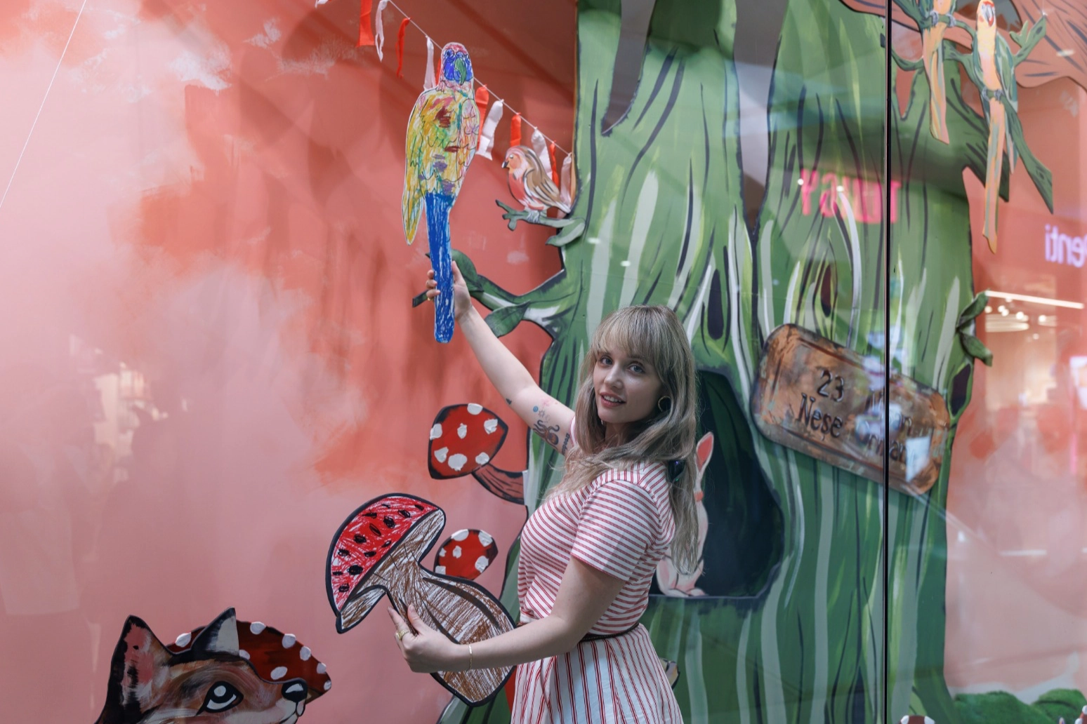 Sanatçı Eda Zamanpur’un “Neşe Ormanı” temasıyla tasarladığı vitrin, çocukların dokunuşlarıyla renklenerek 23 Nisan ruhunu mağazaya taşıdı.