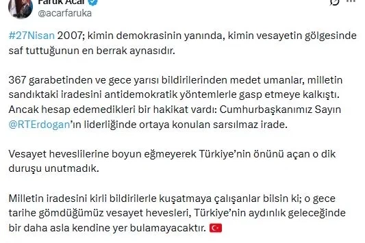 AK Parti'li Acar, sanal medya hesabından yaptığı açıklamada, "27 Nisan 2007; kimin demokrasinin yanında, kimin vesayetin gölgesinde saf tuttuğunun en berrak aynasıdır. 367 garabetinden ve gece yarısı bildirilerinden medet umanlar, milletin sandıktaki iradesini antidemokratik yöntemlerle gasp etmeye kalkıştı. Ancak hesap edemedikleri bir hakikat vardı. Cumhurbaşkanımız Sayın Recep Tayyip Erdoğan’ın liderliğinde ortaya konulan sarsılmaz irade. Vesayet heveslilerine boyun eğmeyerek Türkiye’nin önünü açan o dik duruşu unutmadık. Milletin iradesini kirli bildirilerle kuşatmaya çalışanlar bilsin ki o gece tarihe gömdüğümüz vesayet hevesleri, Türkiye’nin aydınlık geleceğinde bir daha asla kendine yer bulamayacaktır" ifadelerini kullandı. (DHA)