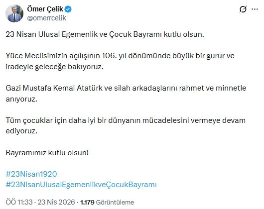 ANKARA, (DHA)- AK Parti Genel Başkan Yardımcısı ve Parti Sözcüsü Ömer Çelik, 23 Nisan Ulusal Egemenlik ve Çocuk Bayramı ile TBMM'nin kuruluşunun 106'ncı yıl dönümüne ilişkin mesaj paylaştı.