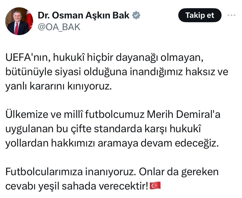 Mikail KARAMAN/ANKARA, (DHA)- GENÇLİK ve Spor Bakanı Osman Aşkın Bak, Avrupa Futbol Federasyonları Birliği'nin (UEFA), A Milli Takım sporcusu Merih Demiral için verdiği 2 maç men kararını kınadıklarını belirtti.Bakan Osman Aşkın Bak, sosyal medya hesabından yaptığı açıklamada, "UEFA'nın hukuki hiçbir dayanağı olmayan, bütünüyle siyasi olduğuna inandığımız haksız ve yanlı kararını kınıyoruz. Ülkemize ve milli futbolcumuz Merih Demiral'a uygulanan bu çifte standarda karşı hukuki yollardan hakkımızı aramaya devam edeceğiz. Futbolcularımıza inanıyoruz. Onlar da gereken cevabı yeşil sahada verecektir" ifadelerini kullandı. (DHA)