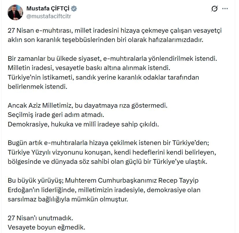 Bakan Çiftçi, sanal medya hesabından yaptığı açıklamada, "27 Nisan e-muhtırası, millet iradesini hizaya çekmeye çalışan vesayetçi aklın son karanlık teşebbüslerinden biri olarak hafızalarımızdadır. Bir zamanlar bu ülkede siyaset, e-muhtıralarla yönlendirilmek istendi. Milletin iradesi, vesayetle baskı altına alınmak istendi. Türkiye'nin istikameti, sandık yerine karanlık odaklar tarafından belirlenmek istendi. Ancak aziz milletimiz, bu dayatmaya rıza göstermedi. Seçilmiş irade geri adım atmadı. Demokrasiye, hukuka ve millî iradeye sahip çıkıldı" dedi.