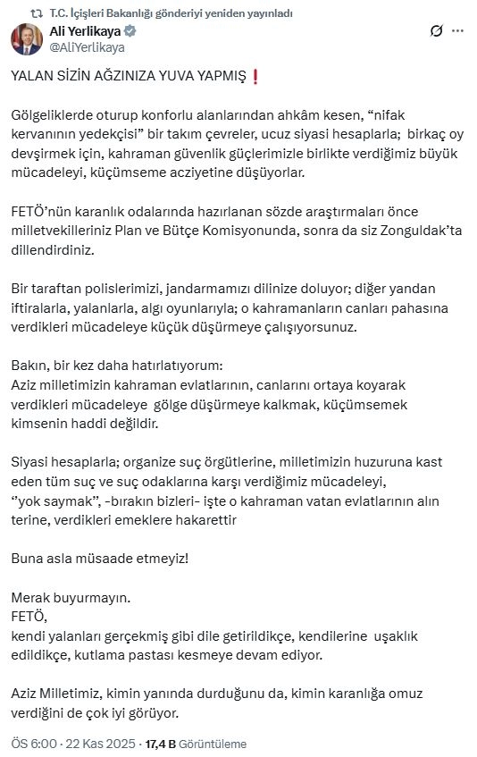 ANKARA, (DHA)- İÇİŞLERİ Bakanı Ali Yerlikaya, CHP Genel Başkanı Özgür Özel'in Zonguldak mitinginde kendisi ile ilgili söylediği sözlere "Yalan sizin ağzınıza yuva yapmış. Gölgeliklerde oturup konforlu alanlarından ahkam kesen, nifak kervanının yedekçisi bir takım çevreler, ucuz siyasi hesaplarla; birkaç oy devşirmek için kahraman güvenlik güçlerimizle birlikte verdiğimiz büyük mücadeleyi, küçümseme acziyetine düşüyorlar" diye karşılık verdi.