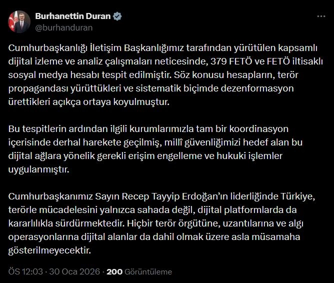 İletişim Başkanı Burhanettin Duran, sanal medya hesabından yaptığı paylaşımda, "Cumhurbaşkanlığı İletişim Başkanlığımız tarafından yürütülen kapsamlı dijital izleme ve analiz çalışmaları neticesinde, 379 FETÖ ve FETÖ iltisaklı sosyal medya hesabı tespit edilmiştir. Söz konusu hesapların, terör propagandası yürüttükleri ve sistematik biçimde dezenformasyon ürettikleri açıkça ortaya koyulmuştur. Bu tespitlerin ardından ilgili kurumlarımızla tam bir koordinasyon içerisinde derhal harekete geçilmiş, milli güvenliğimizi hedef alan bu dijital ağlara yönelik gerekli erişim engelleme ve hukuki işlemler uygulanmıştır. Cumhurbaşkanımız Sayın Recep Tayyip Erdoğan’ın liderliğinde Türkiye, terörle mücadelesini yalnızca sahada değil, dijital platformlarda da kararlılıkla sürdürmektedir. Hiçbir terör örgütüne, uzantılarına ve algı operasyonlarına dijital alanlar da dahil olmak üzere asla müsamaha gösterilmeyecektir" ifadelerini kullandı. (DHA)