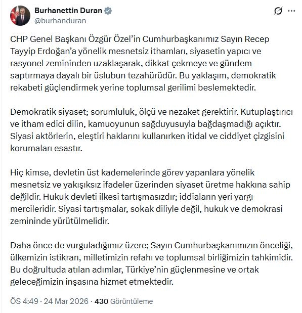 ANKARA, (DHA)- İLETİŞİM Başkanı Burhanettin Duran, "CHP Genel Başkanı Özgür Özel’in Cumhurbaşkanımız Sayın Recep Tayyip Erdoğan’a yönelik mesnetsiz ithamları, siyasetin yapıcı ve rasyonel zemininden uzaklaşarak, dikkat çekmeye ve gündem saptırmaya dayalı bir üslubun tezahürüdür. Demokratik siyaset; sorumluluk, ölçü ve nezaket gerektirir" dedi.