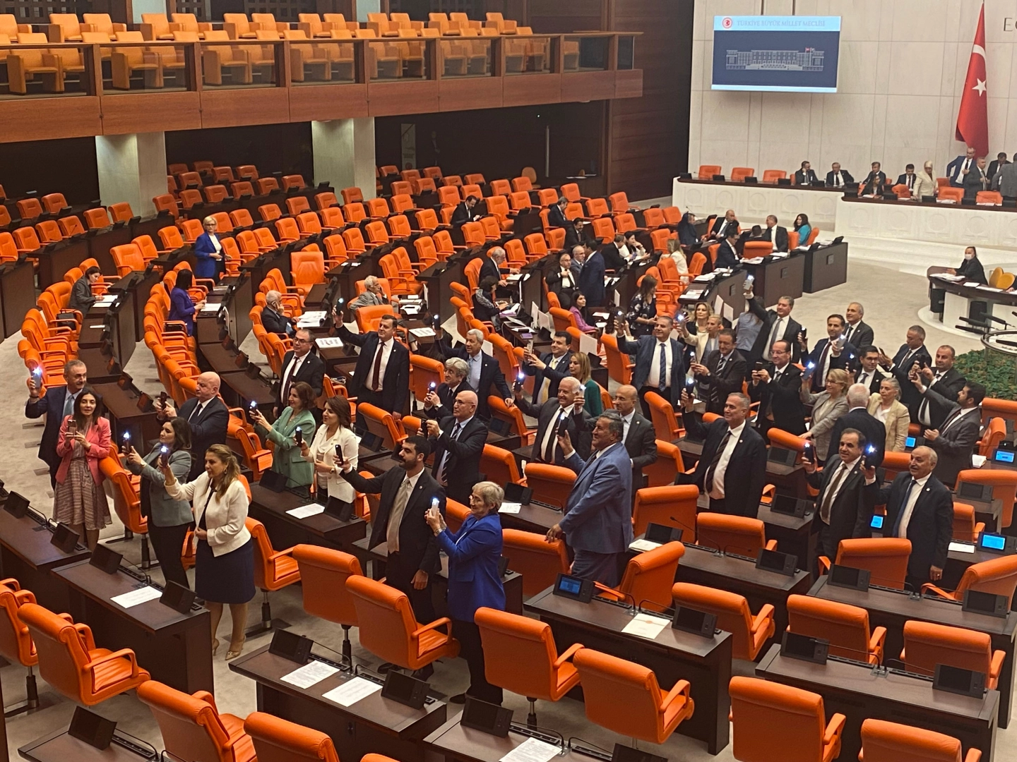 Ali Ekber METE/ANKARA, (DHA)- CHP Grubu TBMM Genel Kurulu'nda, asgari ücretlilere ve emeklilere zam yapılamamasını protesto etmek amacıyla cep telefonlarıyla ışık açma-kapatma eylemi yaptı.TBMM Genel Kurulu, siyasi partilerin grup önerileri, komisyonlardan gelen ve gündem dışı işlerin ardından, 'Öğretmenlik Mesleği Kanunu Teklifi' görüşmelerine başladı. Kanun teklifi üzerine Saadet Partisi adına söz alan Samsun Milletvekili Mehmet Karaman'ın konuşmasının ardından CHP Grup Başkanvekili Murat Emir, "Sayın Başkan, asgari ücretlilere ve emeklilere zam yapılamamasını protesto etmek amacıyla ışıklarımızı 1 dakikalığına yakacağız, söndüreceğiz. Bugün saat 21.00'de milyonlarca vatandaşımızla birlikte sesimizi duyuracağız. Zam yapın, seçim yoksa geçim var" dedi. Bunun üzerine Meclis Başkanvekili Sırrı Süreyya Önder, kürsüde konuşma yapılma imkanının kalmayacağını ifade ederek birleşime 10 dakika ara verdi. Önder, 'Ama bir ricam var, sıralara çıkmayın' diyerek milletvekillerine seslendi. Birleşimin kapanmasının ardından CHP Grubu, ayağa kalktı, telefon fenerlerini yakıp, söndürdü. 'GENEL KURUL GÖRÜŞMELERİ DEVAM EDİYOR'Genel kurul birleşime verilen 10 dakikalık aranın ardından yeniden toplandı. Genel Kurul'da kanun teklifi üzerine görüşmeler devam ediyor. (DHA)