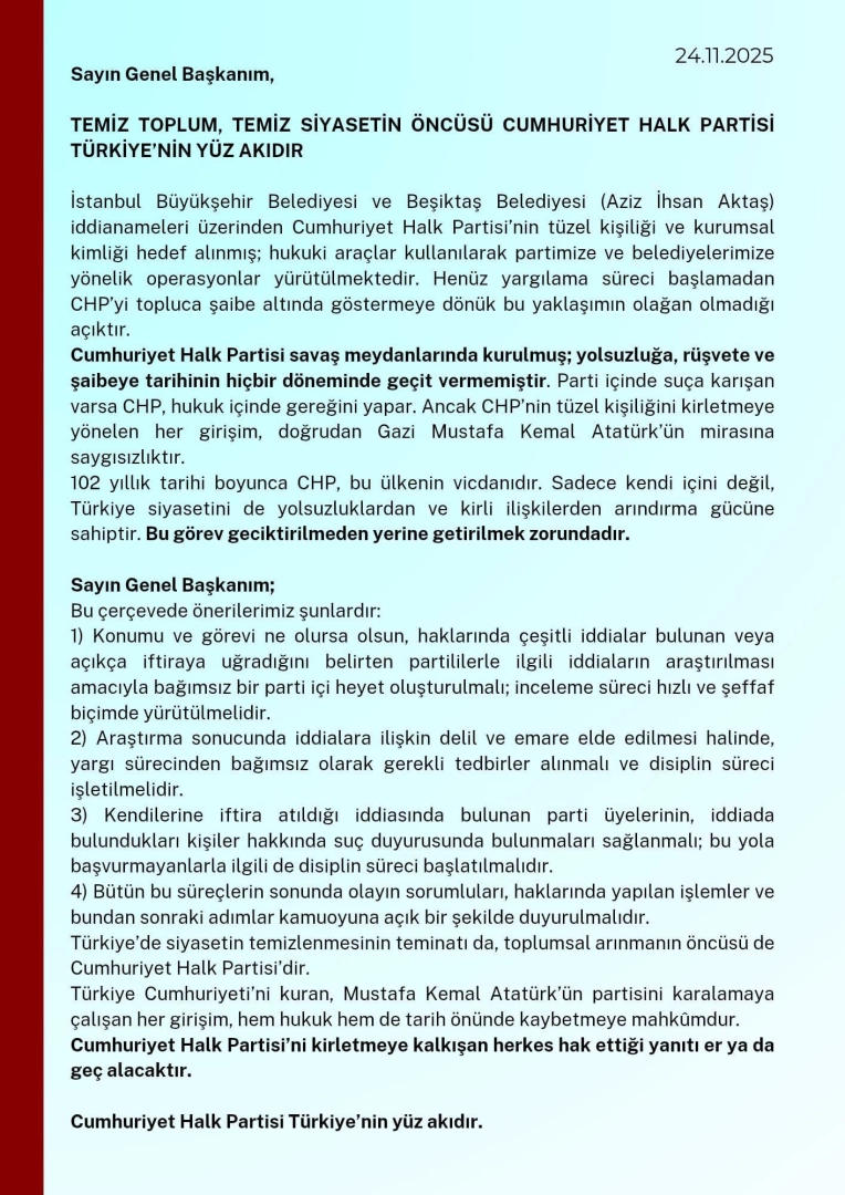 CHP'yi topluca şaibe altında göstermeye dönük bu yaklaşımın olağan olmadığı açıktır. Cumhuriyet Halk Partisi savaş meydanlarında kurulmuş; yolsuzluğa, rüşvete ve şaibeye tarihinin hiçbir döneminde geçit vermemiştir. Parti içinde suça karışan varsa CHP, hukuk içinde gereğini yapar. Ancak CHP'nin tüzel kişiliğini kirletmeye yönelen her girişim, doğrudan Gazi Mustafa Kemal Atatürk'ün mirasına saygısızlıktır. 102 yıllık tarihi boyunca CHP, bu ülkenin vicdanıdır. Sadece kendi içini değil, Türkiye siyasetini de yolsuzluklardan ve kirli ilişkilerden arındırma gücüne sahiptir. Bu görev geciktirilmeden yerine getirilmek zorundadır."