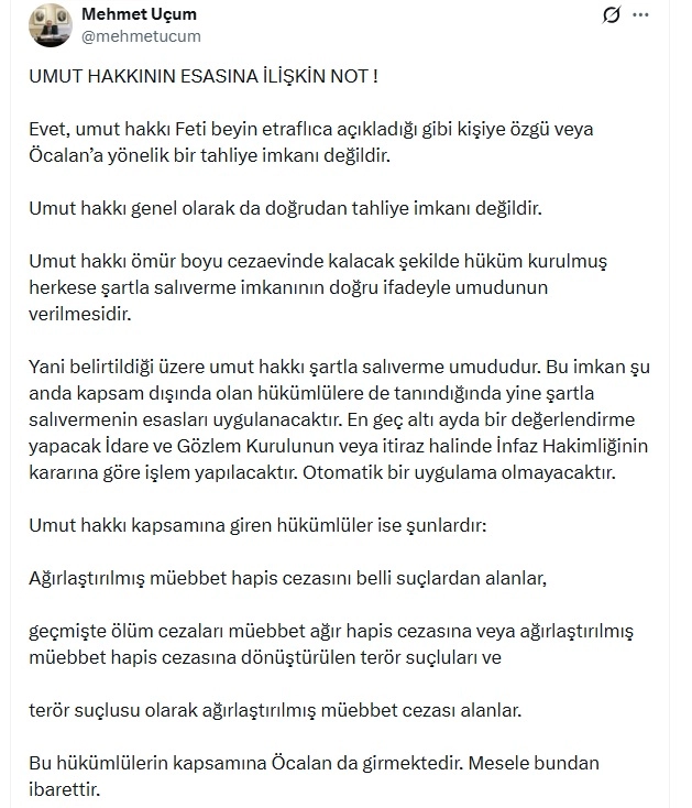 Cumhurbaşkanı Başdanışmanı Uçum, sanal medya üzerinden 'Umut hakkının esasına' ilişkin notuyla yaptığı paylaşımda, "Evet, umut hakkı Feti Bey'in etraflıca açıkladığı gibi kişiye özgü veya Öcalan’a yönelik bir tahliye imkanı değildir. Umut hakkı genel olarak da doğrudan tahliye imkanı değildir. Umut hakkı ömür boyu cezaevinde kalacak şekilde hüküm kurulmuş herkese şartla salıverme imkanının doğru ifadeyle umudunun verilmesidir. Yani belirtildiği üzere umut hakkı şartla salıverme umududur. Bu imkan şu anda kapsam dışında olan hükümlülere de tanındığında yine şartla salıvermenin esasları uygulanacaktır. En geç altı ayda bir değerlendirme yapacak İdare ve Gözlem Kurulunun veya itiraz halinde İnfaz Hakimliğinin kararına göre işlem yapılacaktır. Otomatik bir uygulama olmayacaktır. Umut hakkı kapsamına giren hükümlüler ise şunlardır: Ağırlaştırılmış müebbet hapis cezasını belli suçlardan alanlar, geçmişte ölüm cezaları müebbet ağır hapis cezasına veya ağırlaştırılmış müebbet hapis cezasına dönüştürülen terör suçluları ve terör suçlusu olarak ağırlaştırılmış müebbet cezası alanlar. Bu hükümlülerin kapsamına Öcalan da girmektedir. Mesele bundan ibarettir" ifadelerine yer verdi. (DHA)