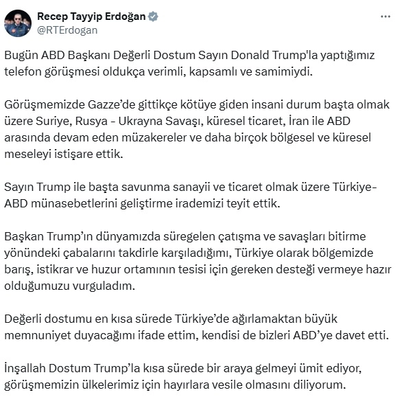 CUMHURBAŞKANI ERDOĞAN’DAN GÖRÜŞMEYE İLİŞKİN PAYLAŞIMCumhurbaşkanı Recep Tayyip Erdoğan, ABD Başkanı Donald Trump ile yaptığı telefon görüşmesine ilişkin sosyal medya hesabından paylaşım yaptı. Erdoğan, "Bugün ABD Başkanı değerli dostum Sayın Donald Trump'la yaptığımız telefon görüşmesi oldukça verimli, kapsamlı ve samimiydi. Görüşmemizde Gazze'de gittikçe kötüye giden insani durum başta olmak üzere Suriye, Rusya - Ukrayna Savaşı, küresel ticaret, İran ile ABD arasında devam eden müzakereler ve daha birçok bölgesel ve küresel meseleyi istişare ettik. Sayın Trump ile başta savunma sanayii ve ticaret olmak üzere Türkiye-ABD münasebetlerini geliştirme irademizi teyit ettik. Başkan Trump’ın dünyamızda süregelen çatışma ve savaşları bitirme yönündeki çabalarını takdirle karşıladığımı, Türkiye olarak bölgemizde barış, istikrar ve huzur ortamının tesisi için gereken desteği vermeye hazır olduğumuzu vurguladım. Değerli dostumu en kısa sürede Türkiye’de ağırlamaktan büyük memnuniyet duyacağımı ifade ettim, kendisi de bizleri ABD’ye davet etti. İnşallah Dostum Trump'la kısa sürede bir araya gelmeyi ümit ediyor, görüşmemizin ülkelerimiz için hayırlara vesile olmasını diliyorum" ifadelerine yer verdi. (DHA)ANKARA, (DHA)-